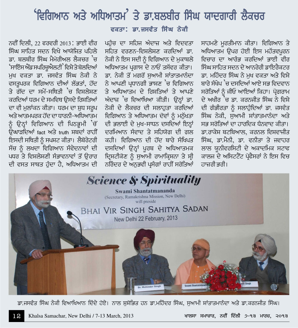 First Dr. Balbir Singh Memorial Lecture, by J.S. Neki (Professor of Eminence, Punjabi University, Patiala) on Science & Spirituality, Presided by Swami Shantatmananda (Secretary, Ramakrishna Mission, New Delhi) dt.22 Feb.2013 >>Report