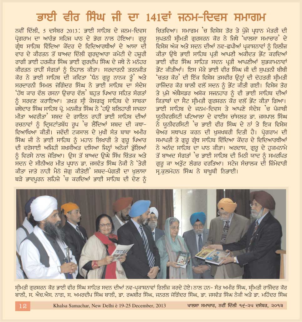 141st Birthday Celebration of Bhai Vir Singh, Dec. 5, 2013 >>Report