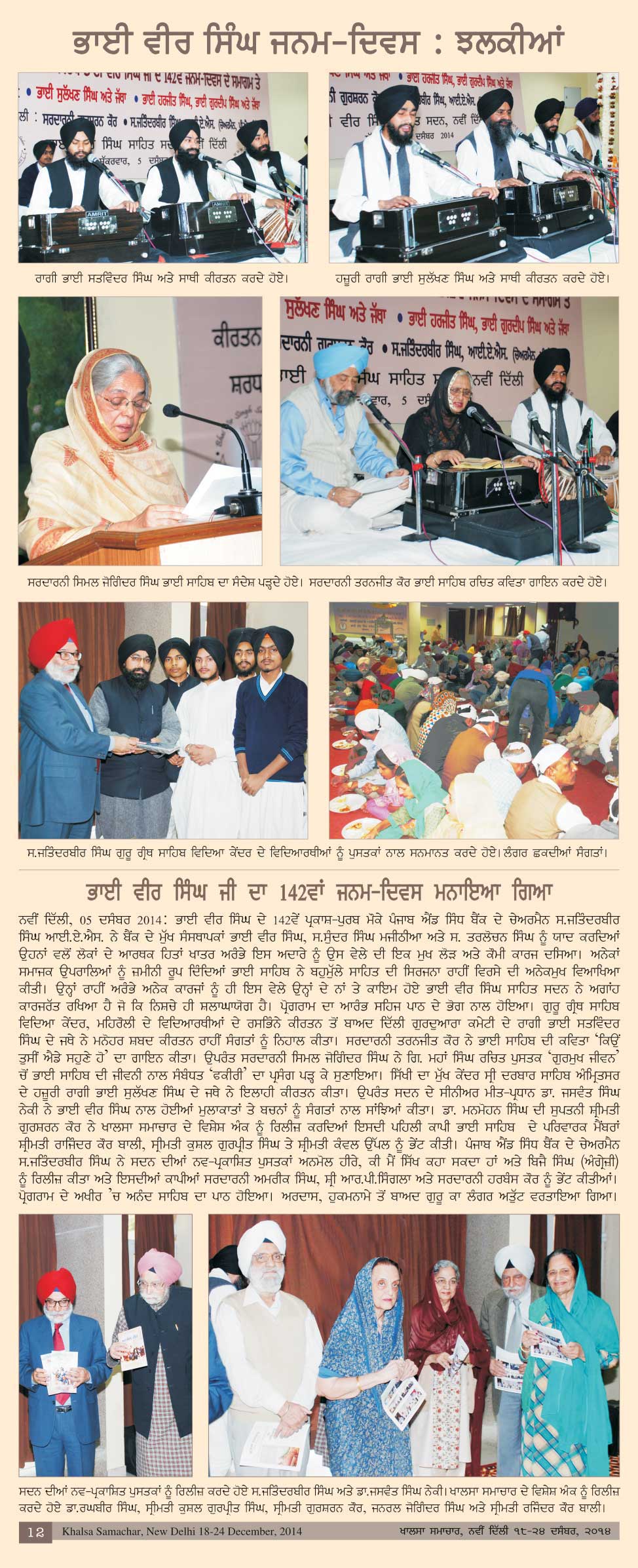 142nd Birthday Celebration of Bhai Vir Singh, Dec. 5, 2014 >>Report
