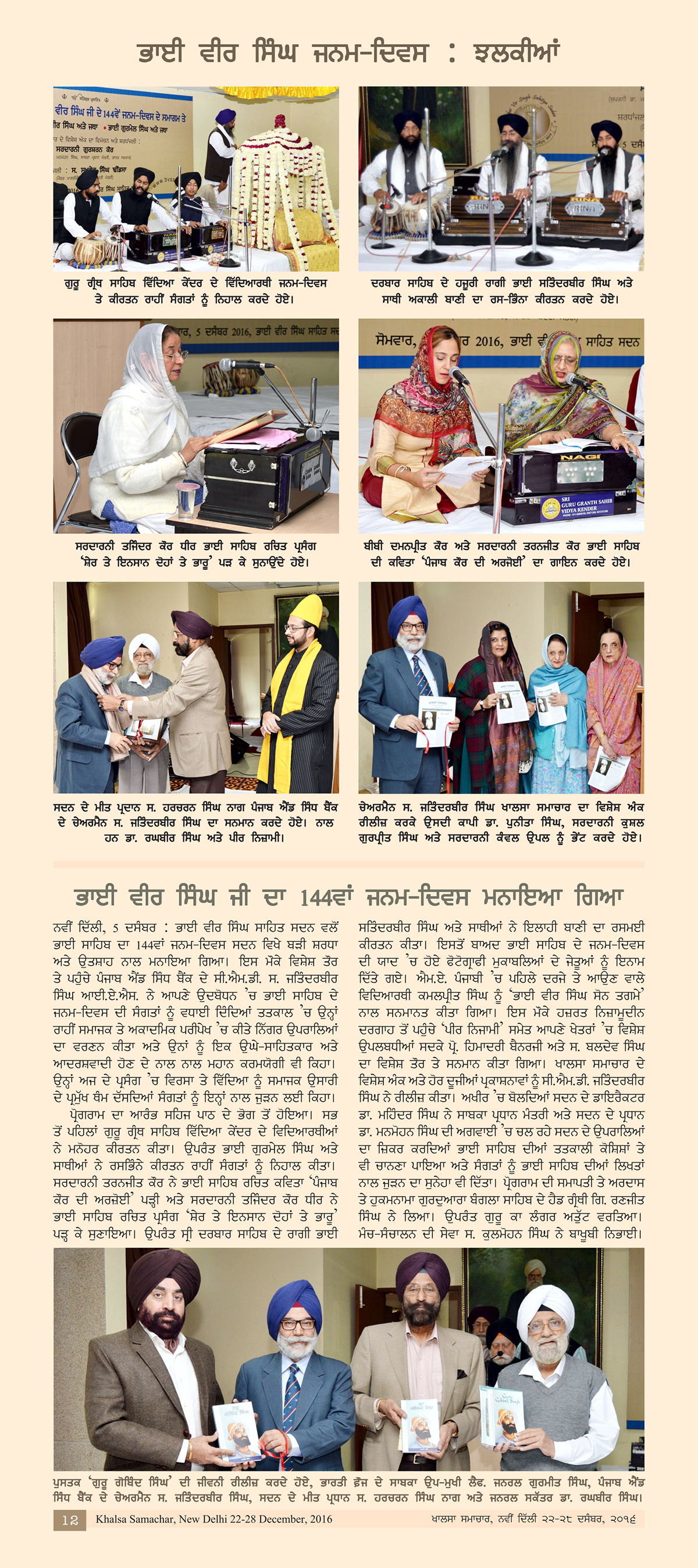 144rd Birthday Celebration of Bhai Vir Singh, Dec. 5, 2016 >>Report