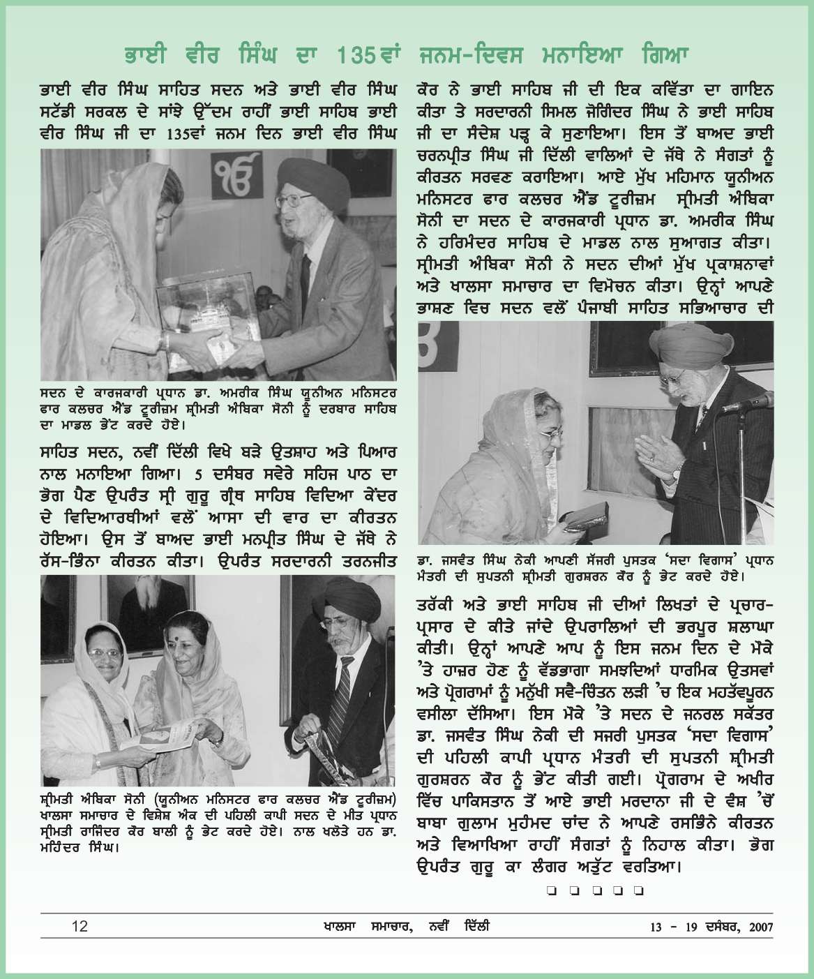 135th Birthday Celebration of Bhai Vir Singh, Dec. 5, 2007 >>Report