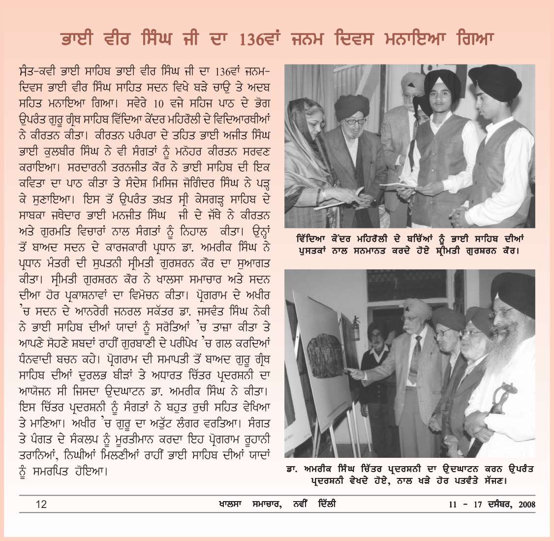 136th Birthday Celebration of Bhai Vir Singh, Dec. 5, 2008 >>Report