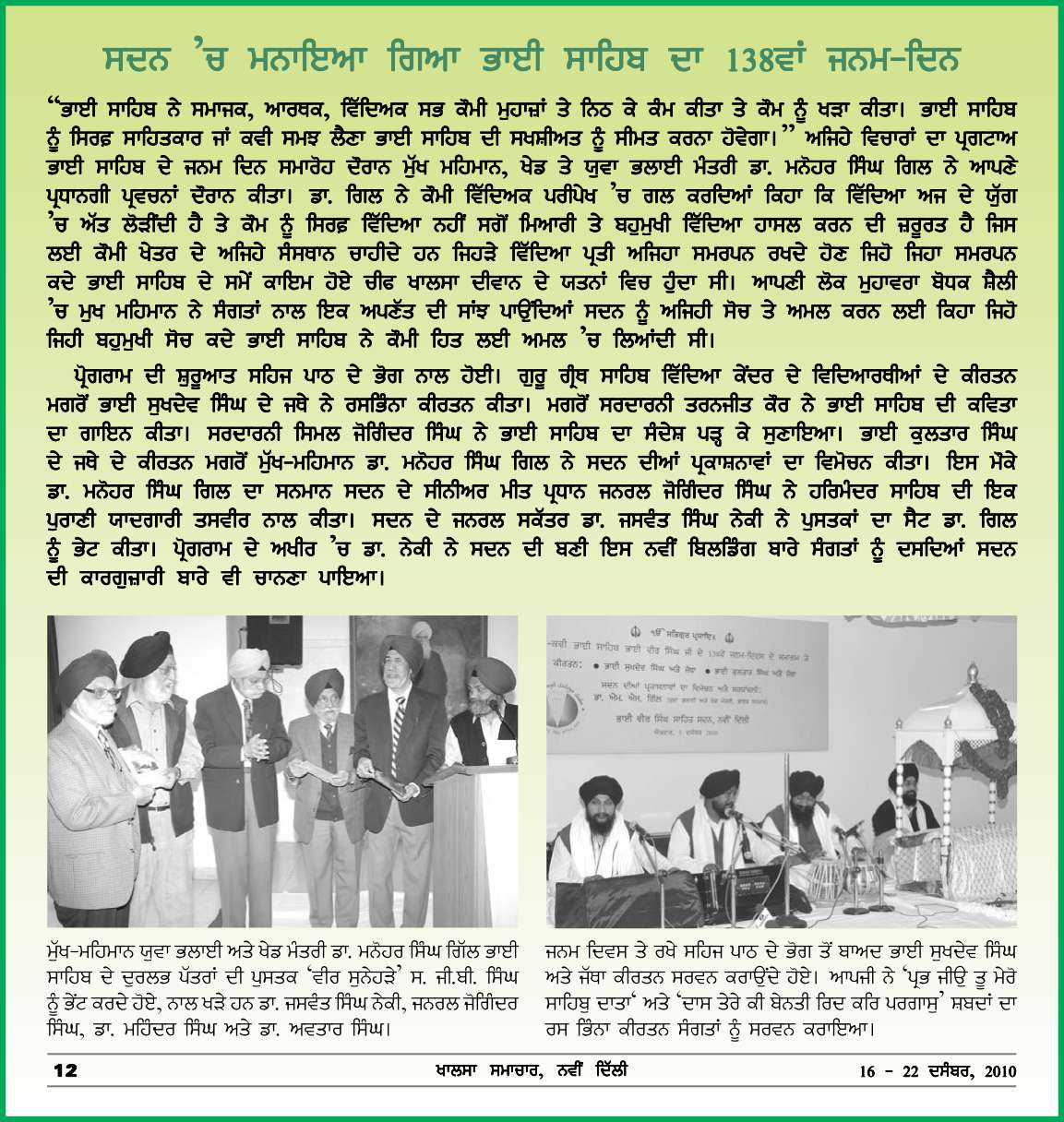 138th Birthday Celebration of Bhai Vir Singh, Dec. 5, 2010 >>Report