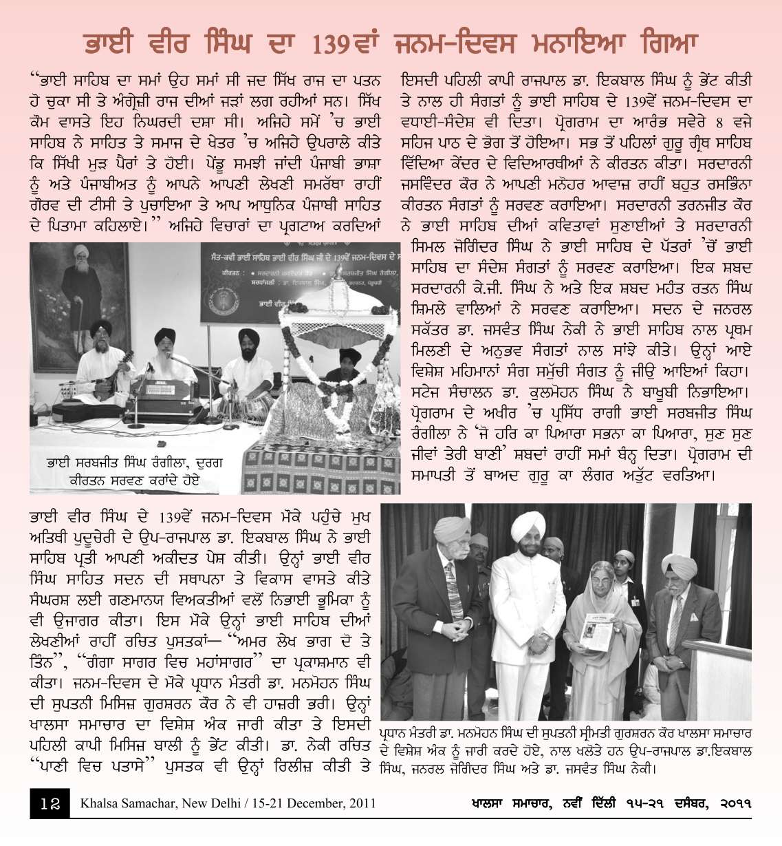 139th Birthday Celebration of Bhai Vir Singh, Dec. 5, 2011 >>Report