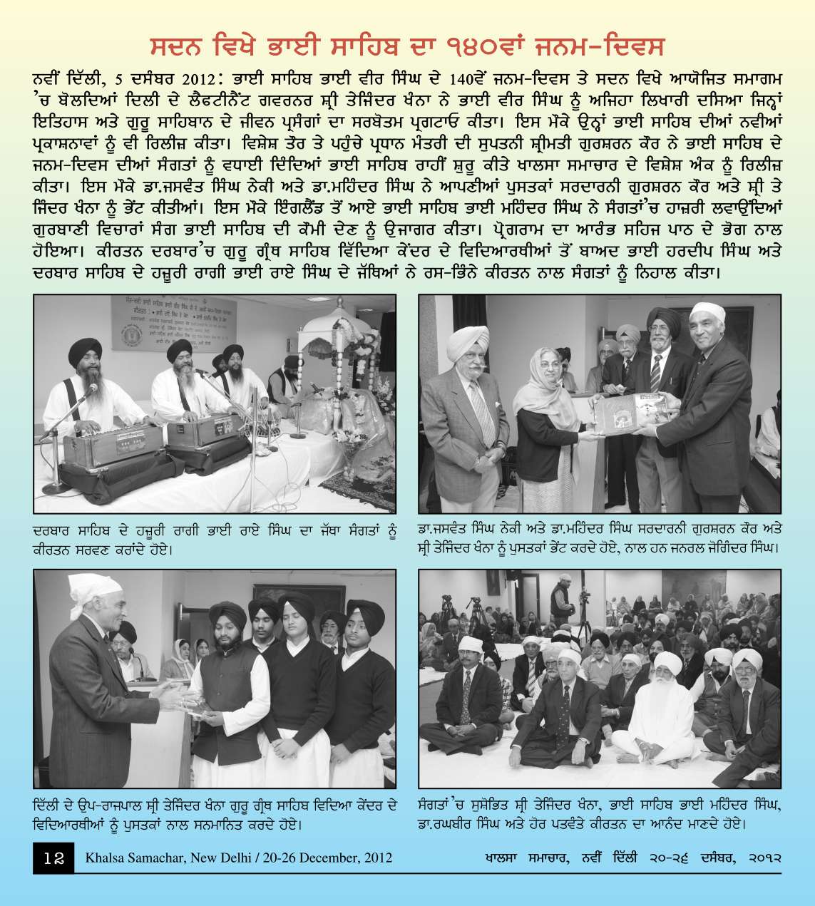 140th Birthday Celebration of Bhai Vir Singh, Dec. 5, 2012 >>Report