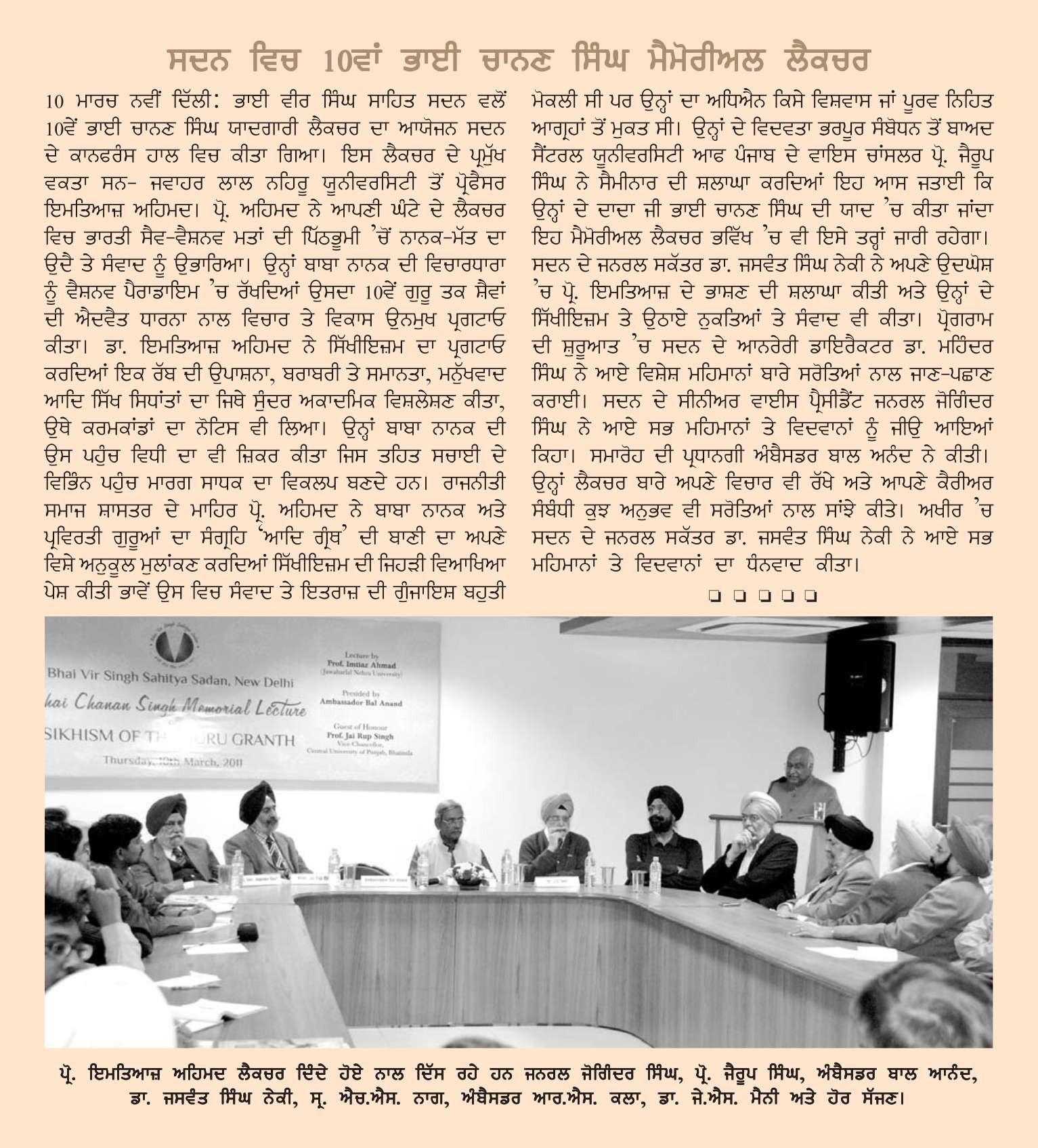 The 10th lecture was delivered by Prof. Imtiaz Ahmad (Jawaharlal Nehru University) “SIKHISM OF THE GURU GRANTH” on Thursday, 10th March, 2011. >>Report