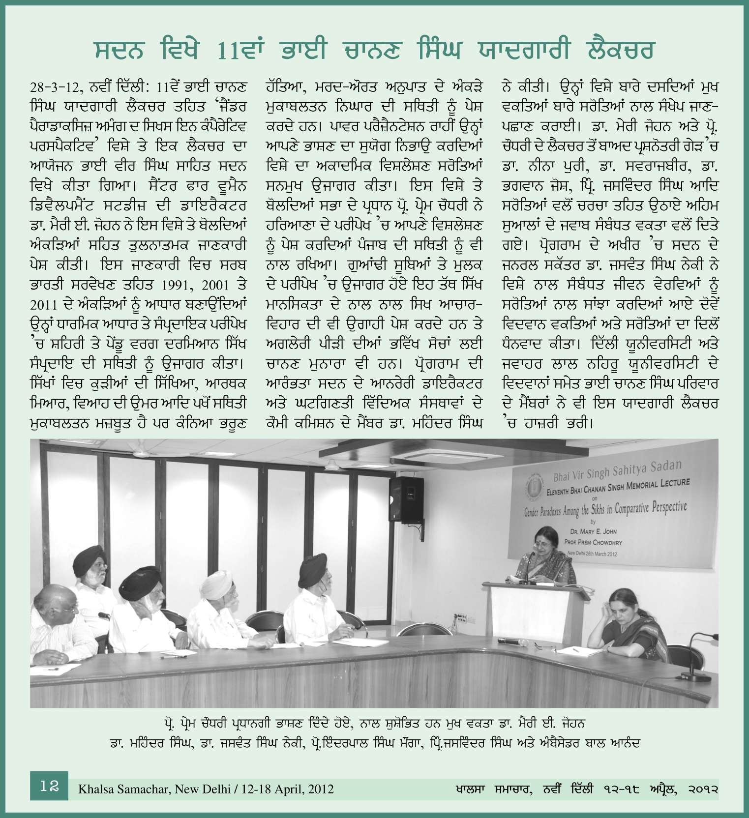 The 11th Lecture by Dr. Mary E. John (Director, Centre for Women's Development Studies) on "Gender Paradoxes among the Sikhs in Comparative Perspective" on Wednesday, March 28, 2012. >>Report
