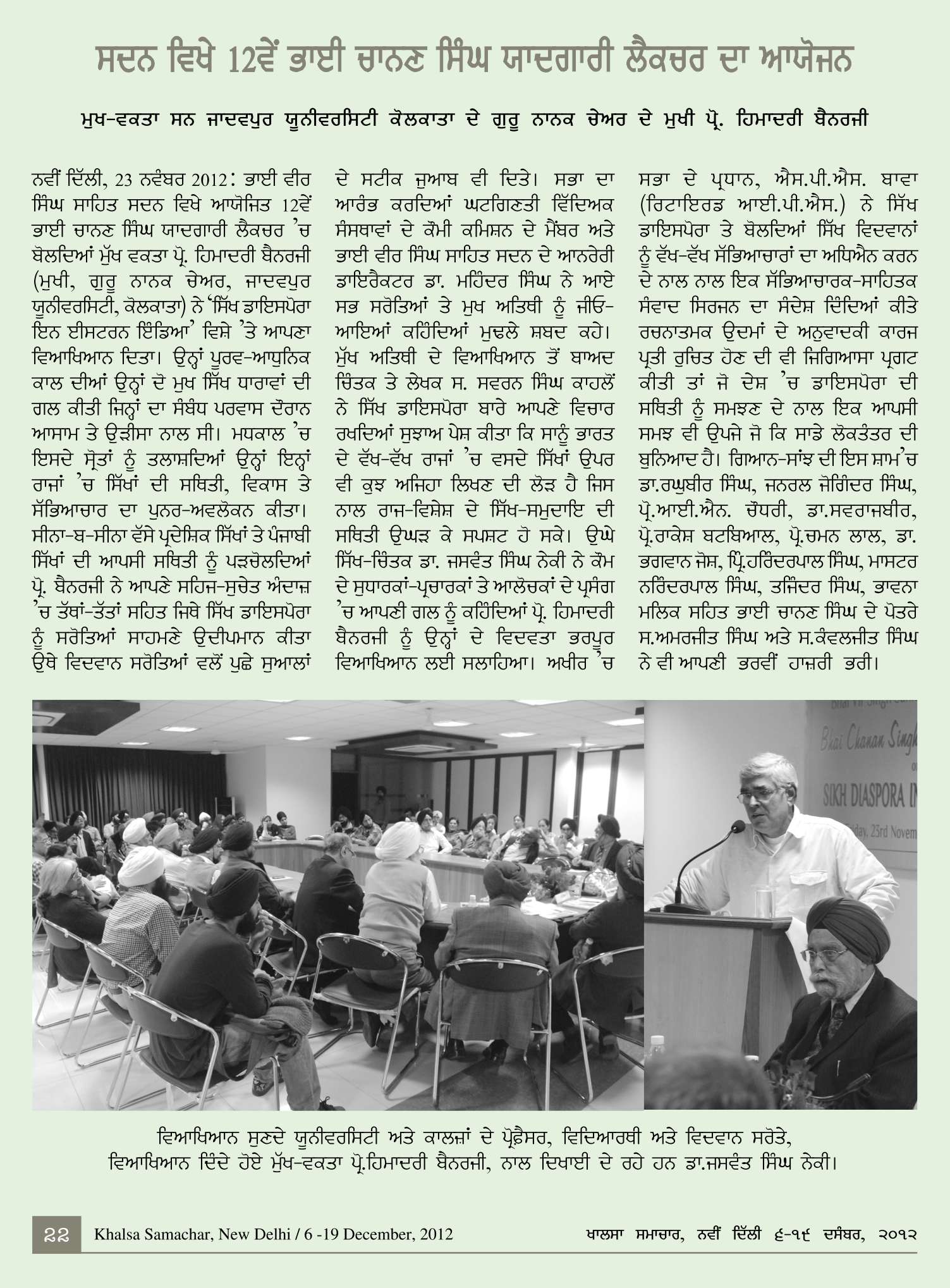 The 12th Lecture by Prof. Himadri Banerji (Head Guru Nanak Chair, Jadavpur University, West Bengal) on 23rd Nov. 2012 "Sikh diaspora in Eastern and North eastern India" >>Report