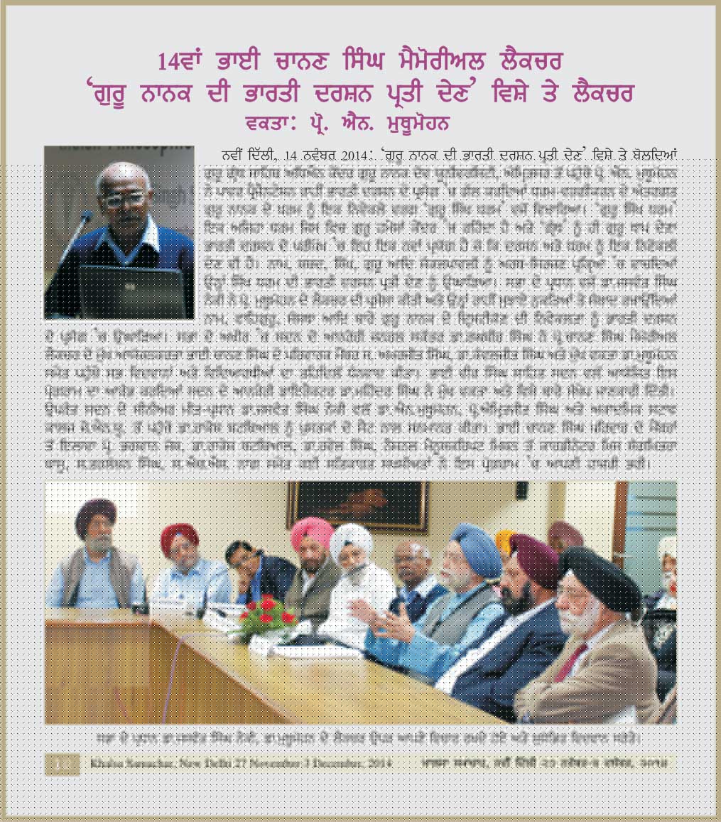 The 14th Lecture on "Guru Nanak's Contribution to Indian Philosophical Thought" by Prof. N. Muthu Mohan (Centre of Studies in Sri Guru Granth Sahib, Guru Nanak Dev University, Amritsar) on Friday, November 14, 2014. >>Report