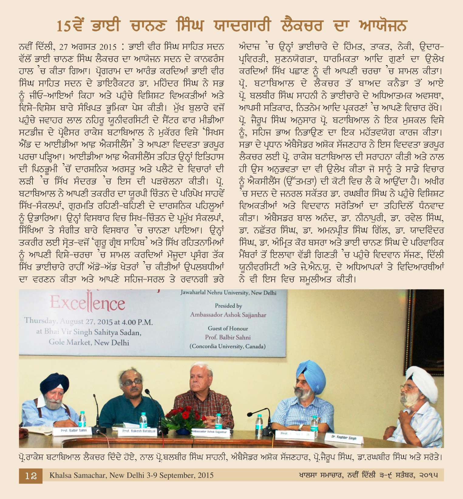 The 15th Lecture on "Sikh and the Idea of Excellence" by Prof. Rakesh Batabyal (Centre of Media Studies, Jawaharlal Nehru University, New Delhi), Presided over by Ambassador Ashok Sajjanhar, Guest of Honour Prof. Balbir Sahni (Concordia University, Canada) on Thursday, Aurust 27, 2015. >>Report
