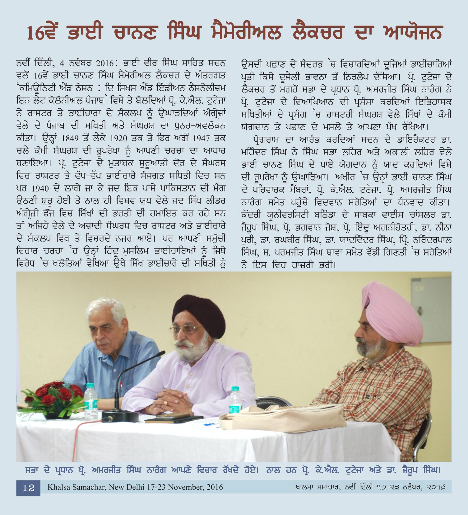 The 16th Lecture on "Community and Nation: The Sikhs and Indian Nationalism in Late Colonial Punjab" by Prof. K. L. Tuteja and presided over by Prof. Sucheta Mahajan on November, 4th 2016. Report>>
