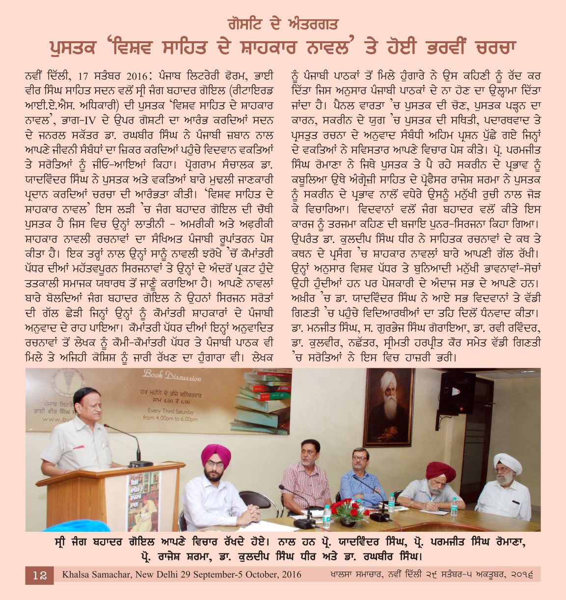 September 17, 2016, Book Discussion on Jung Bahadur Goyal’s "Vishav Sahit de Shahkar Novel" at Punjab Literary Forum, Bhai Vir Singh Sahitya Sadan, New Delhi. Report>>