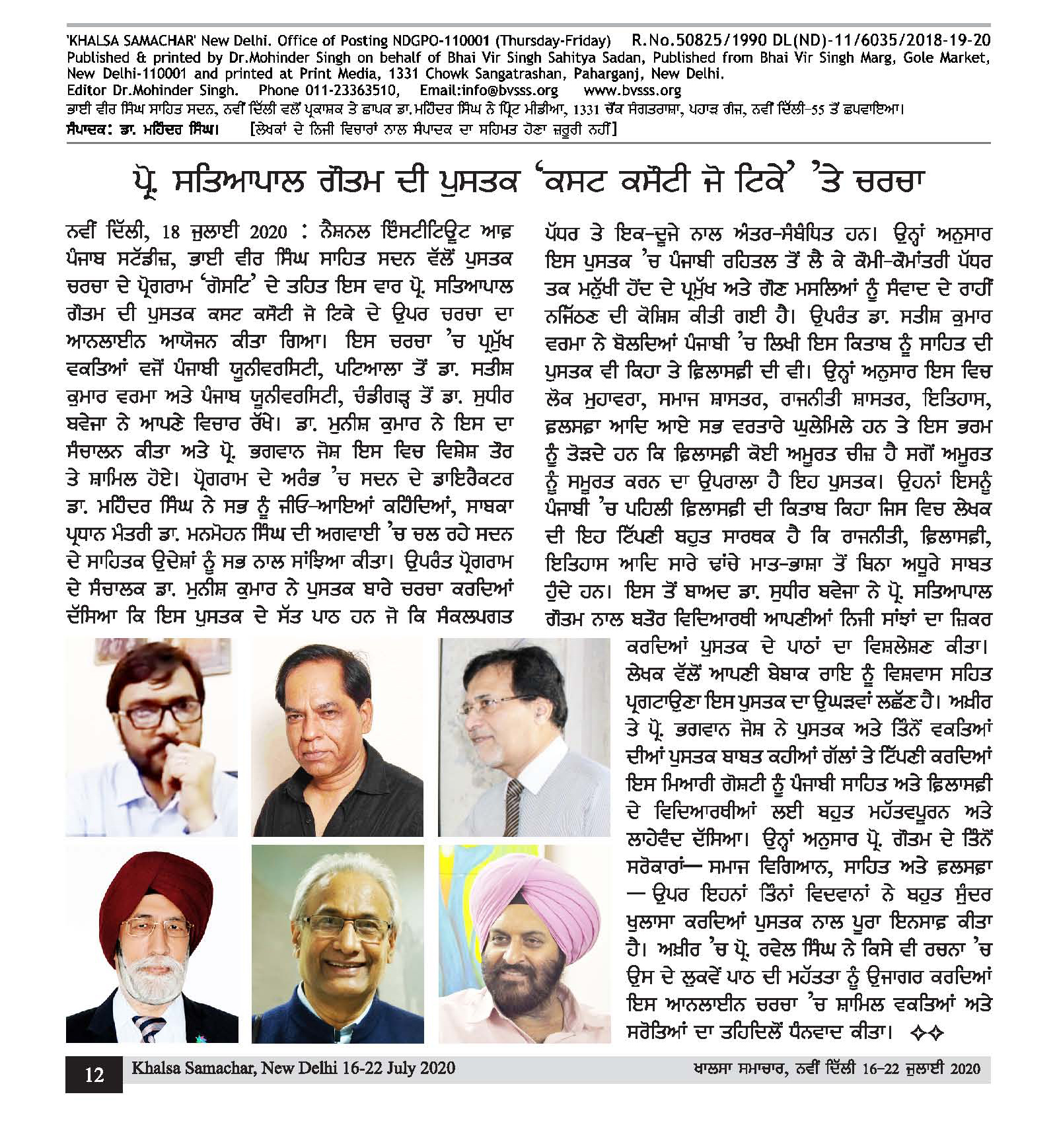July 18, 2020 - Book Discussion on Kast Kasauti Jo Teike by Satyapal Gautam, Panelists: Dr.Satish Kumar Verma, Dr.Sudhir Kumar Baweja, Moderator: Dr.Munish Kumar at BVSSS, New Delhi. It was live webcast. Report>>
