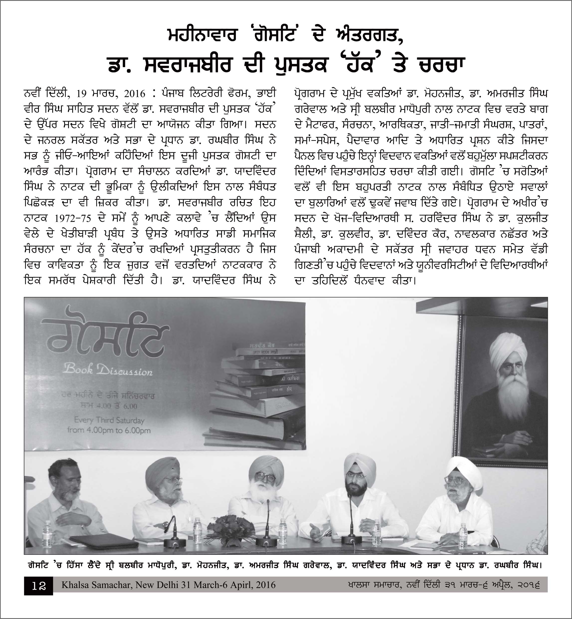 March 19, 2016, Book Discussion on HAQ a play by Dr. Swarajbir at Punjab Literary Forum, Bhai Vir Singh Sahitya Sadan, New Delhi. Report>>