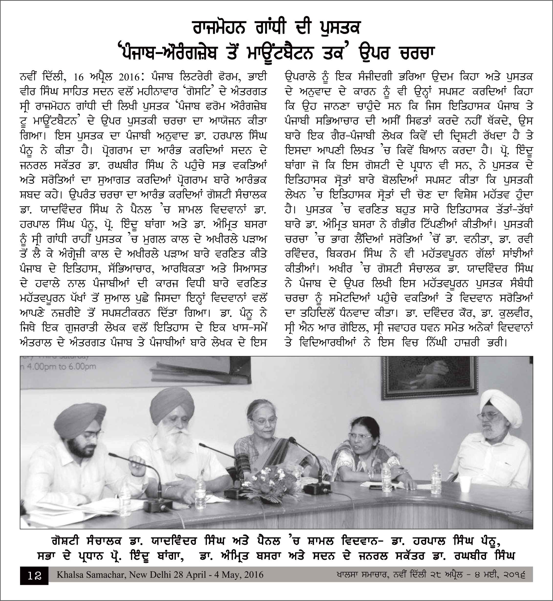 April 16, 2016, Book Discussion on Punjabi translation of Sh.Rajmohan Gandhi’s book “Punjab–Aurangzeb Ton Mountbatten Tak Da Itihaas” by Dr.H.S. Pannu at Punjab Literary Forum, Bhai Vir Singh Sahitya Sadan, New Delhi. Report>>