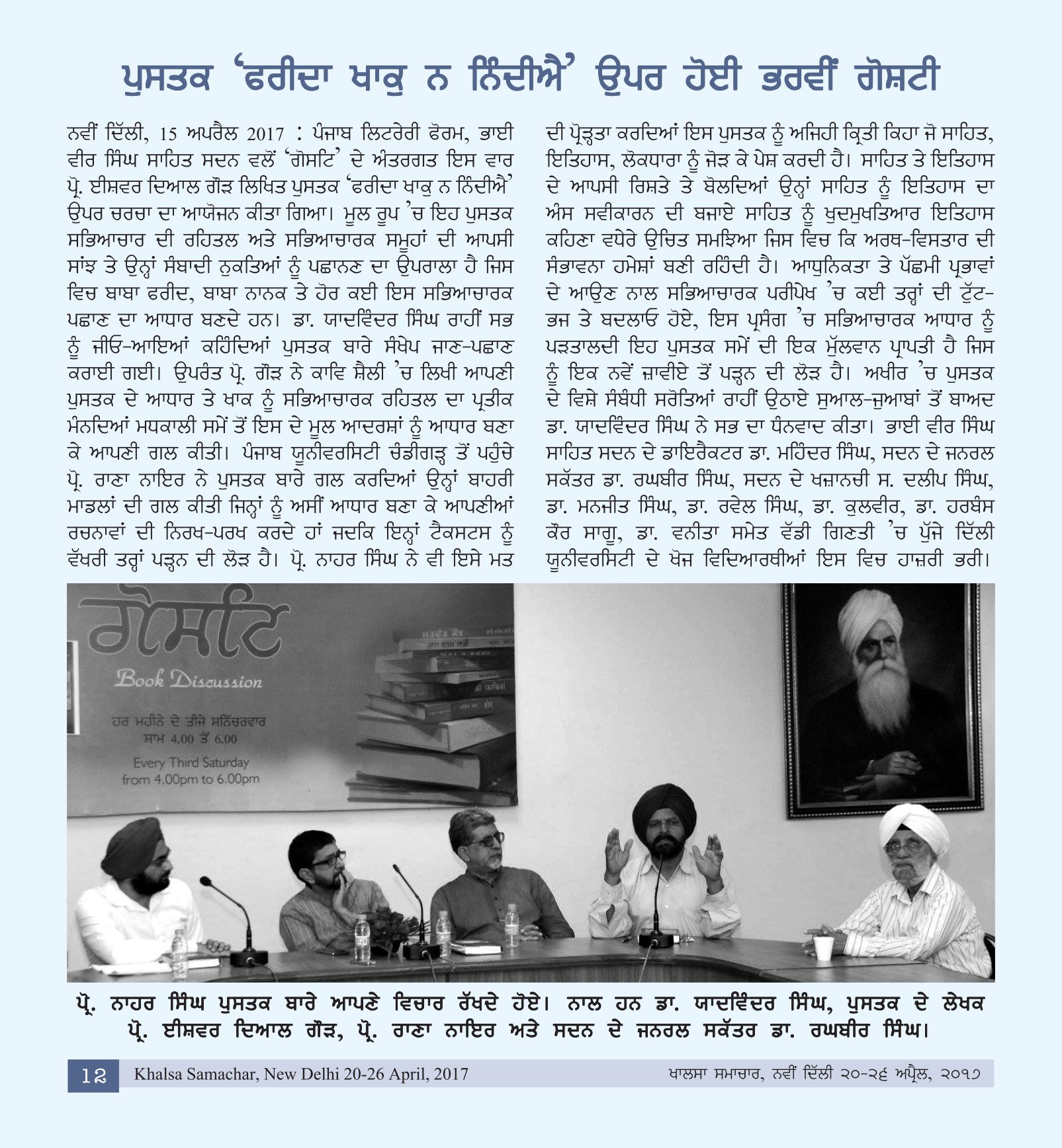 April 15, 2017 : Book Discussion on "Farida Khak na Nindiye" by Prof. Ishwar Dayal Gaur, Discussants: Author along with Prof. Rana Nayar (PU, CHD.) and Prof. Nahar Singh (PU, CHD) at Bhai Vir Singh Sahitya Sadan, New Delhi. Report>>