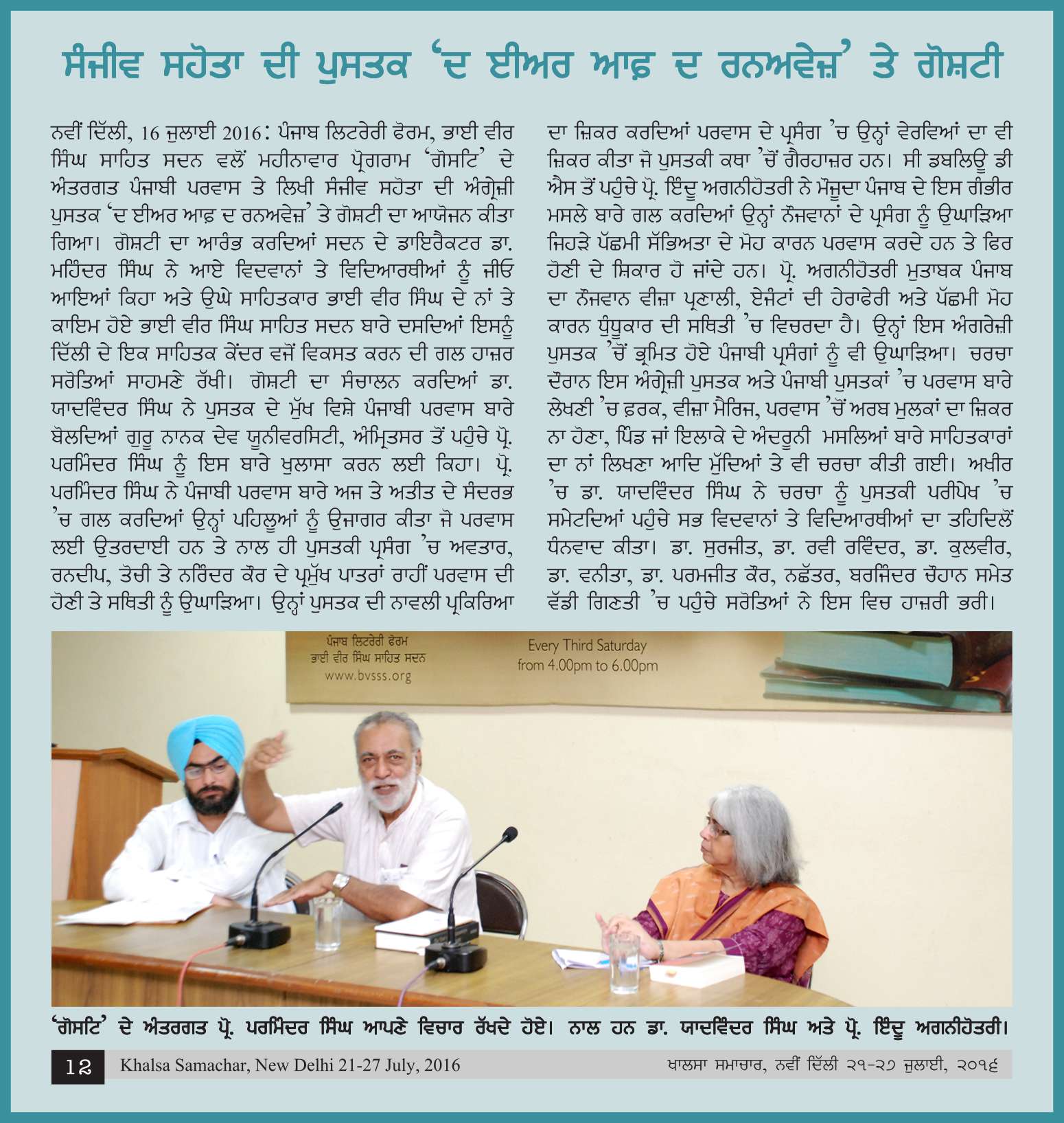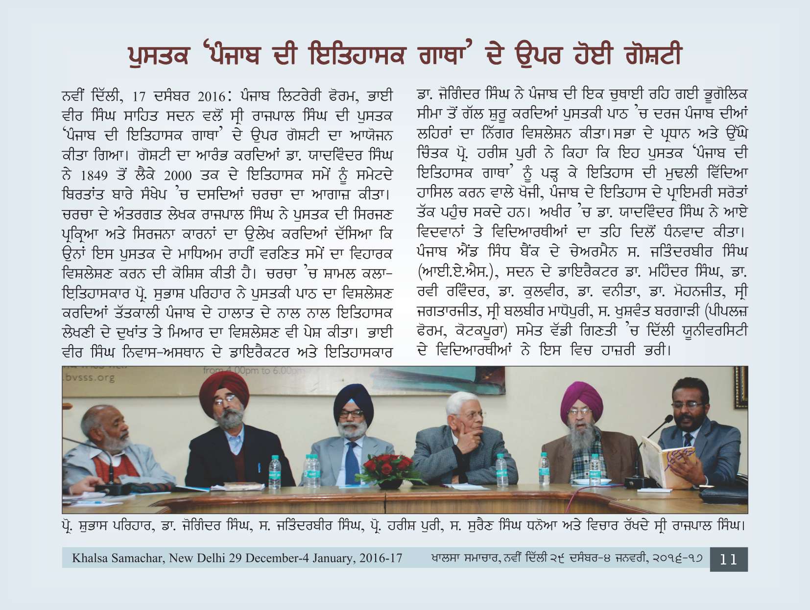 December 17, 2016, Book Discussion on "Punjab di Itihasic Gatha" by Raj Paul Singh, Panelists: Author along with Dr.Joginder Singh & Prof.Subhash Parihar, Presided by Prof.Harish Puri at Punjab Literary Forum, Bhai Vir Singh Sahitya Sadan, New Delhi. Report>>
