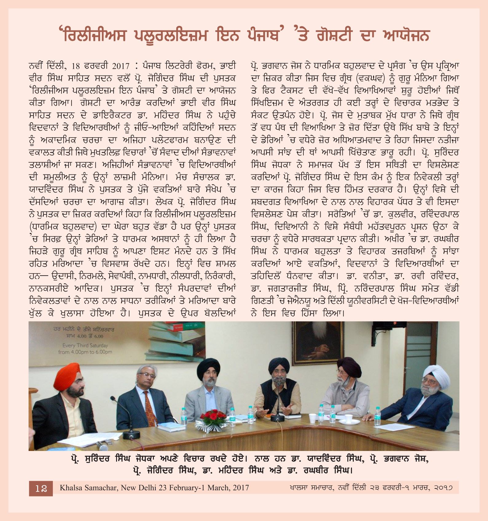 February 18, 2017 : Book Discussion on "Religious Pluralism in Punjab" by Prof.Joginder Singh, Panelists: Prof.Joginder Singh (Author), Prof.Bhagwan Josh (JNU) & Prof.Surinder S. Jodhka (JNU) at Bhai Vir Singh Sahitya Sadan, New Delhi. Report>>