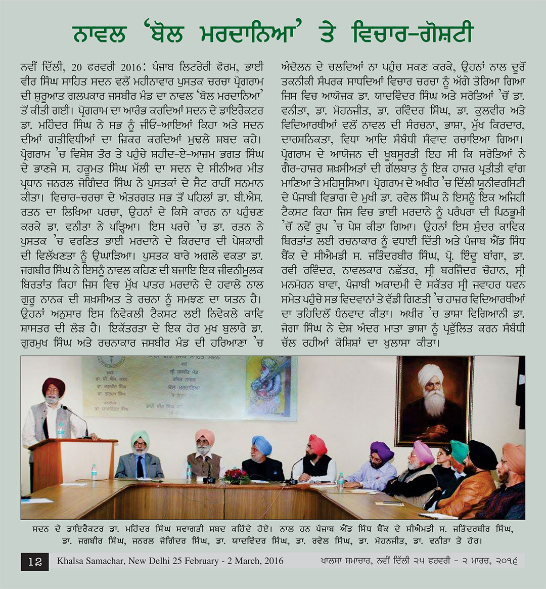February 20, 2016, Book Discussion on BOL MARDANEA by Jasbeer Mand at Punjab Literary Forum, Bhai Vir Singh Sahitya Sadan, New Delhi. Report>>