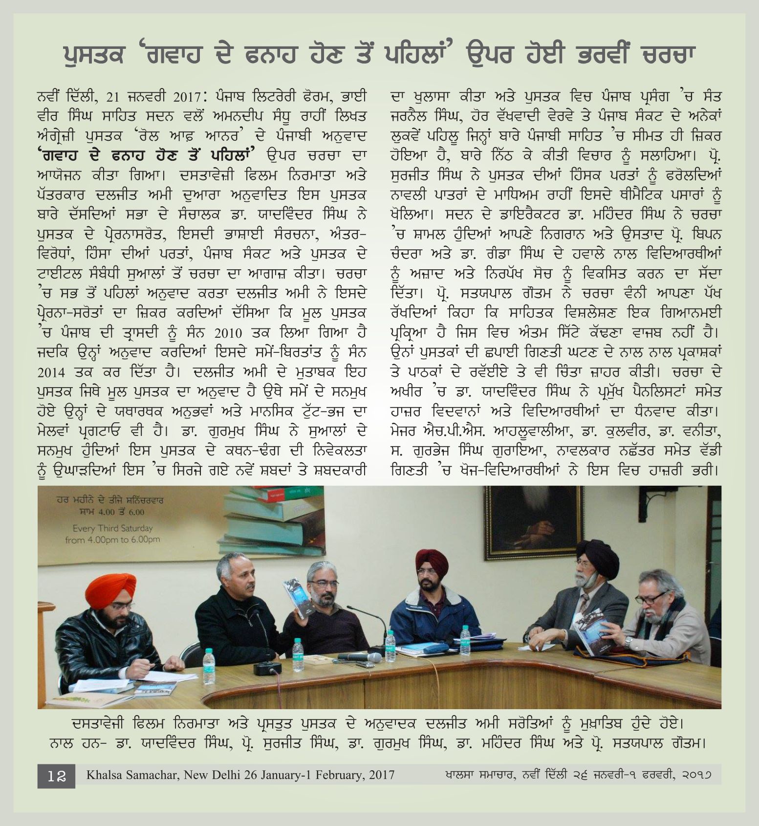 February 17, 2018 : Book Discussion on Jaswant Singh Zafar’s Bhagat Satguru Hamara Panelists include Prof. Avtar Singh (Phagwara), Dr.Sumail Singh Sidhu (Bathinda) and the author, presided over by Dr.Sidharth (Eminent Artist) at Bhai Vir Singh Sahitya Sadan, New Delhi. Report>>