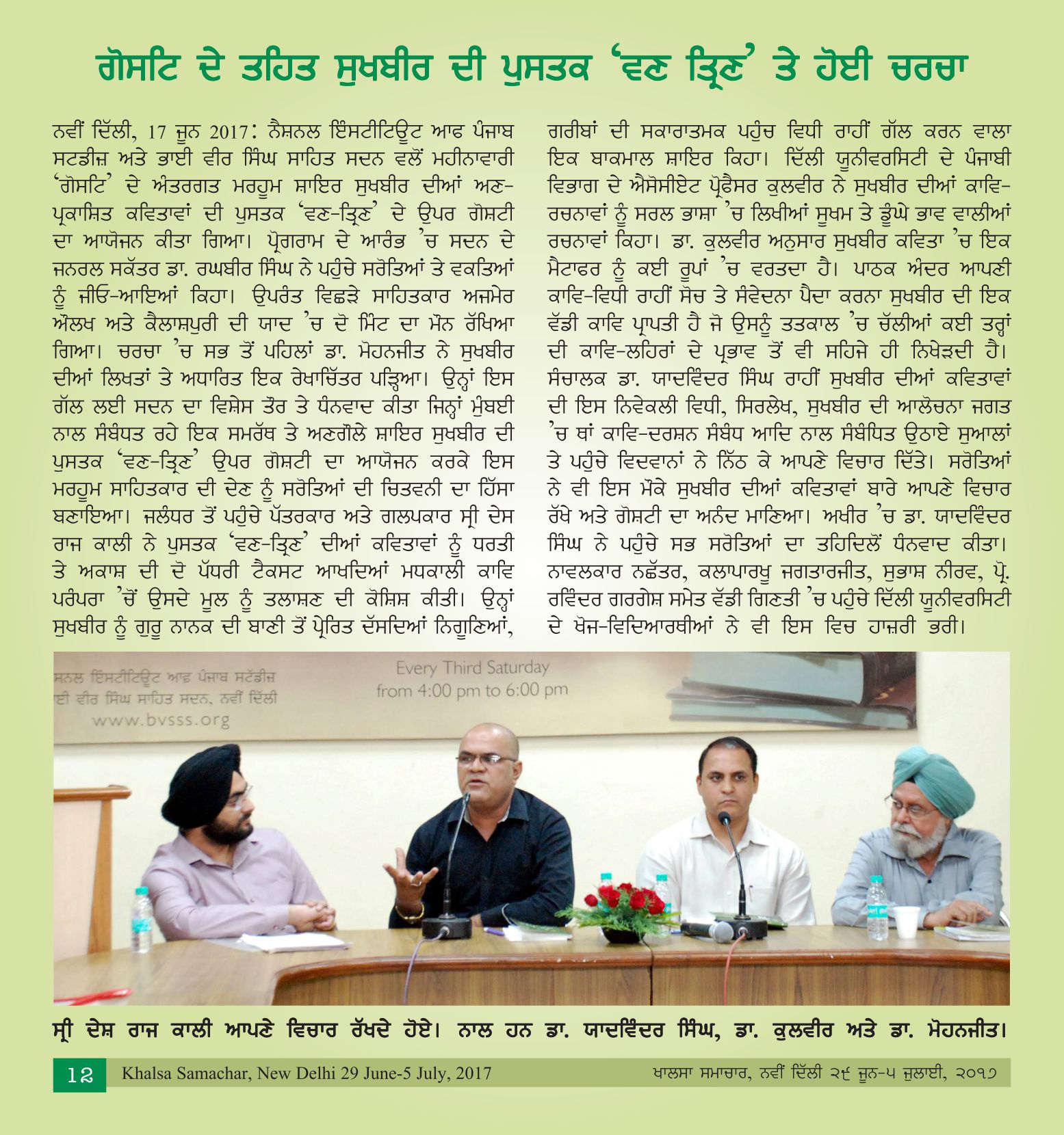 June 17, 2017 : Book Discussion on "VANN-TRINN" by Sukhbir, Discussants: Dr.Mohanjit (Eminent Poet), Sh.Des Raj Kali (Journalist and fiction writer), Dr.Kulvir (Associate professor, DU) at Bhai Vir Singh Sahitya Sadan, New Delhi. Report>>