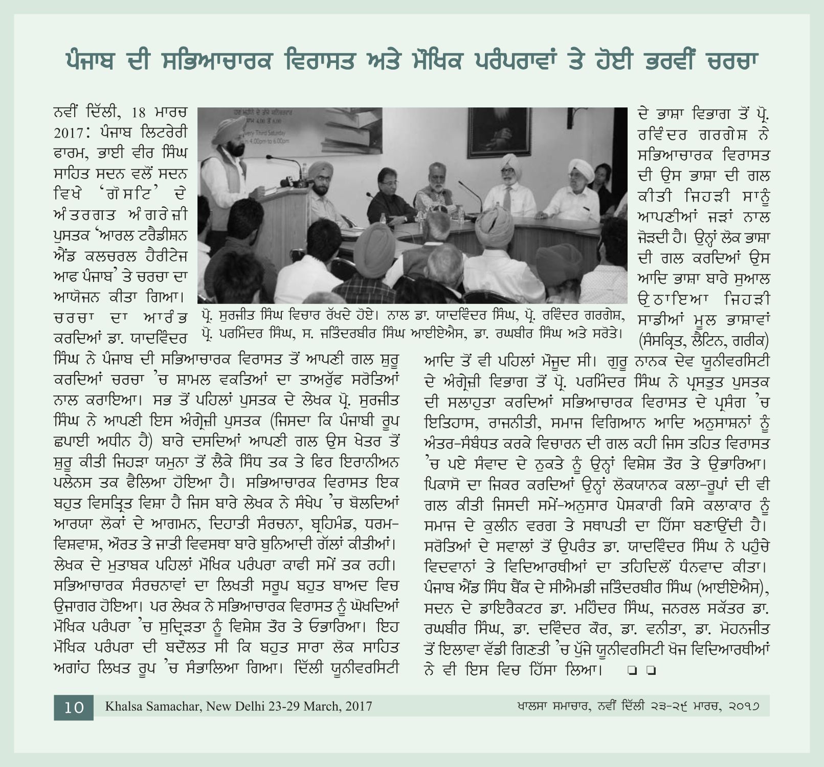 March 18, 2017 : Book Discussion on "ORAL TRADITIONS & CULTURAL HERITAGE OF PUNJAB" by Prof.Surjeet Singh, Discussants shall be Author along with Prof.Ravinder Gargesh (DU) & Prof.Parminder Singh (GNDU) at Bhai Vir Singh Sahitya Sadan, New Delhi. Report>>