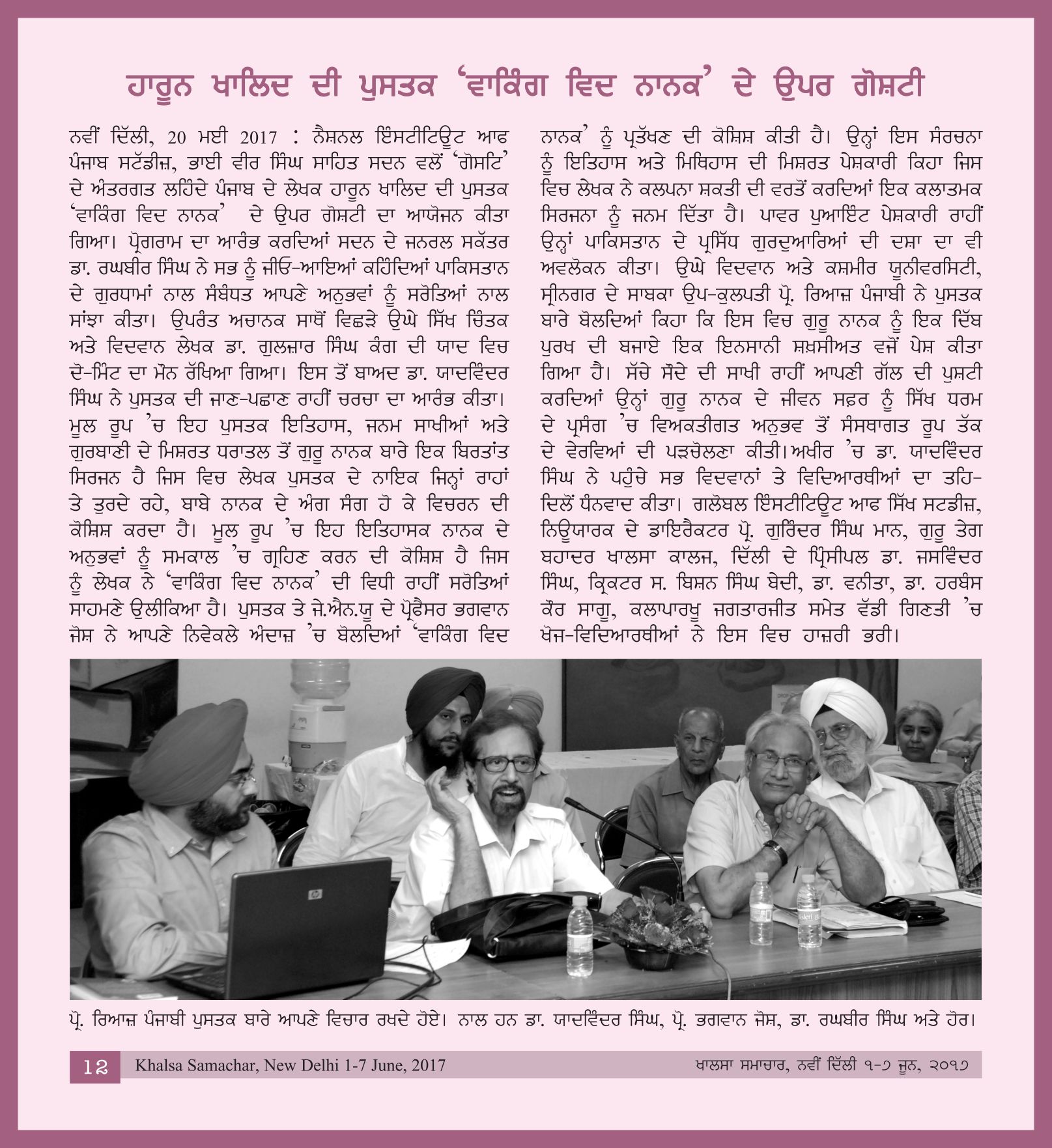 May 20, 2017 : Book Discussion on "WALKING WITH NANAK" by Haroon Khalid, Discussants: Prof.Riyaz Punjabi, Former VC, University of Kashmir and Prof. Bhagwan Josh, Centre for Historical Studies, JNU at Bhai Vir Singh Sahitya Sadan, New Delhi. Report>>