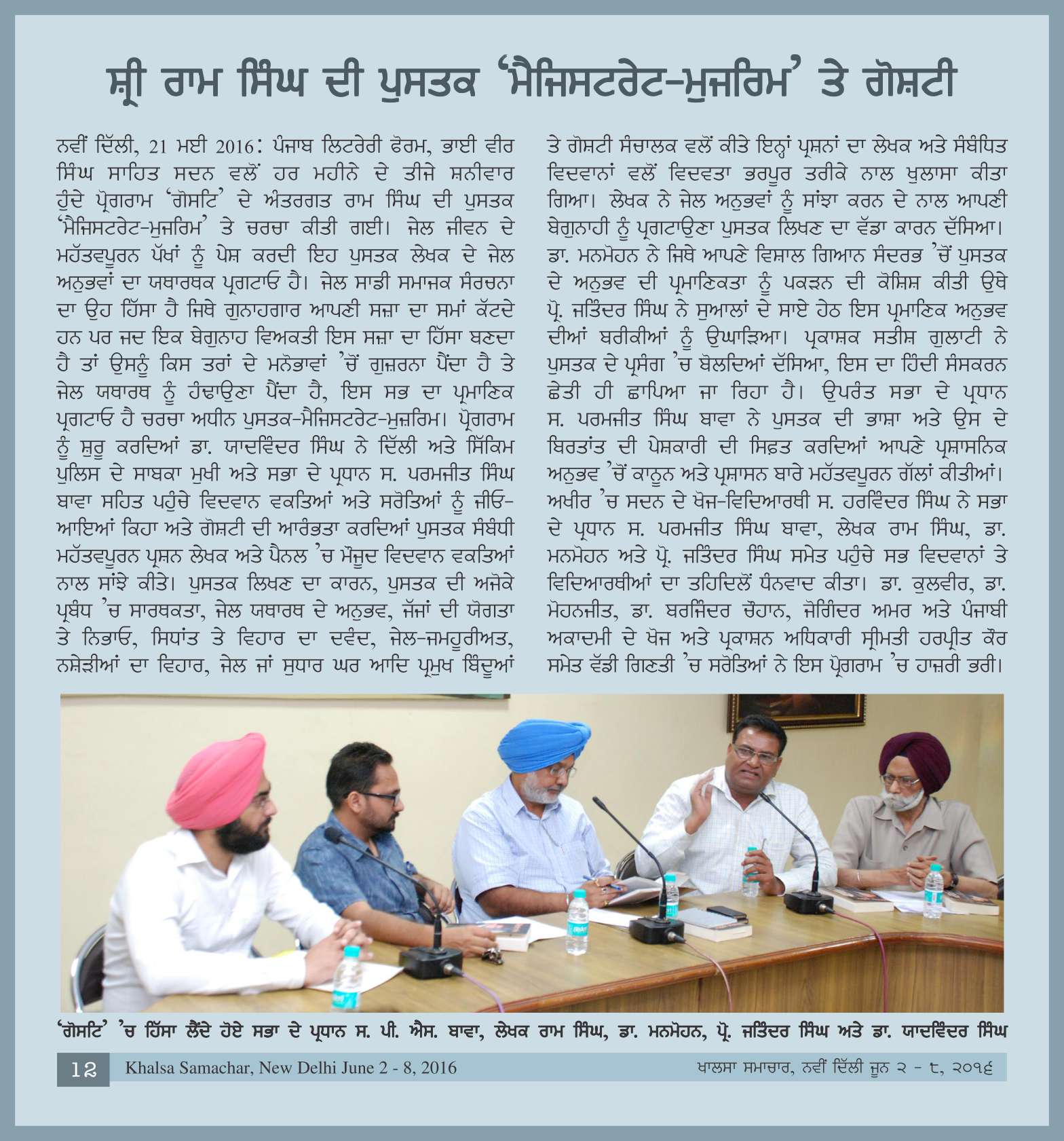 May 21, 2016, Book Discussion on Sh. Ram Singh’s book MAGISTRATE MUJRIM at Punjab Literary Forum, Bhai Vir Singh Sahitya Sadan, New Delhi. Report>>