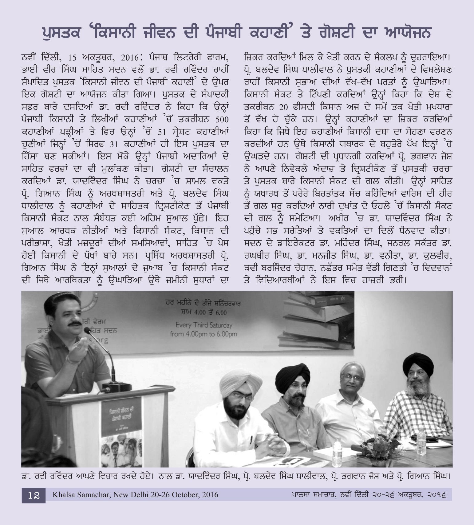 October 15, 2016, Book Discussion on "Kisani Jeevan Di Punjabi Kahani" Edited by Dr.Ravi Ravinder, DU at Punjab Literary Forum, Bhai Vir Singh Sahitya Sadan, New Delhi. Report>>