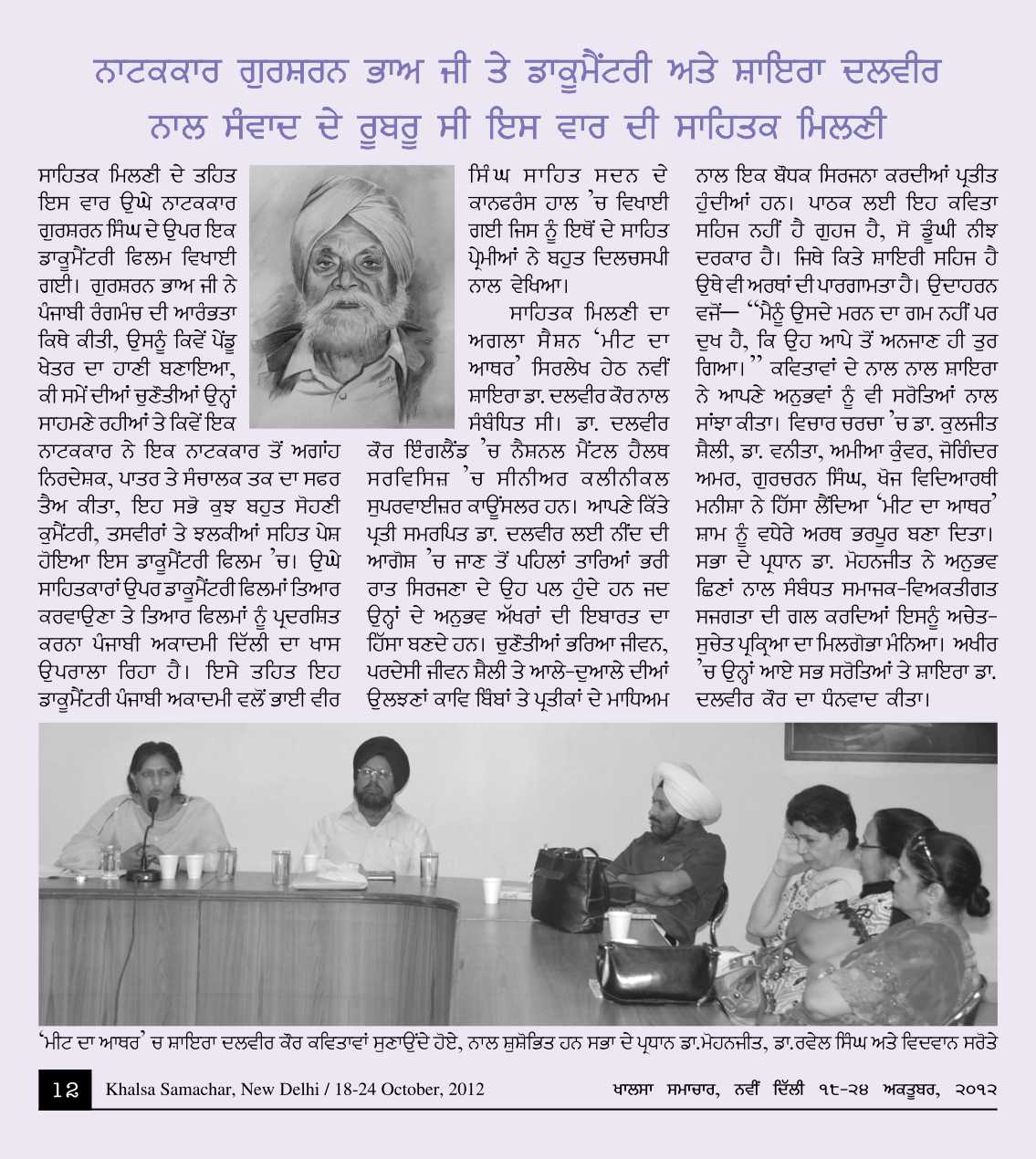 October 6, 2012, Documentary on Dramatist Gursharan Bhau and Meet with Shayara Dalvir : presided over by Dr.Mohanjeet. Report>>