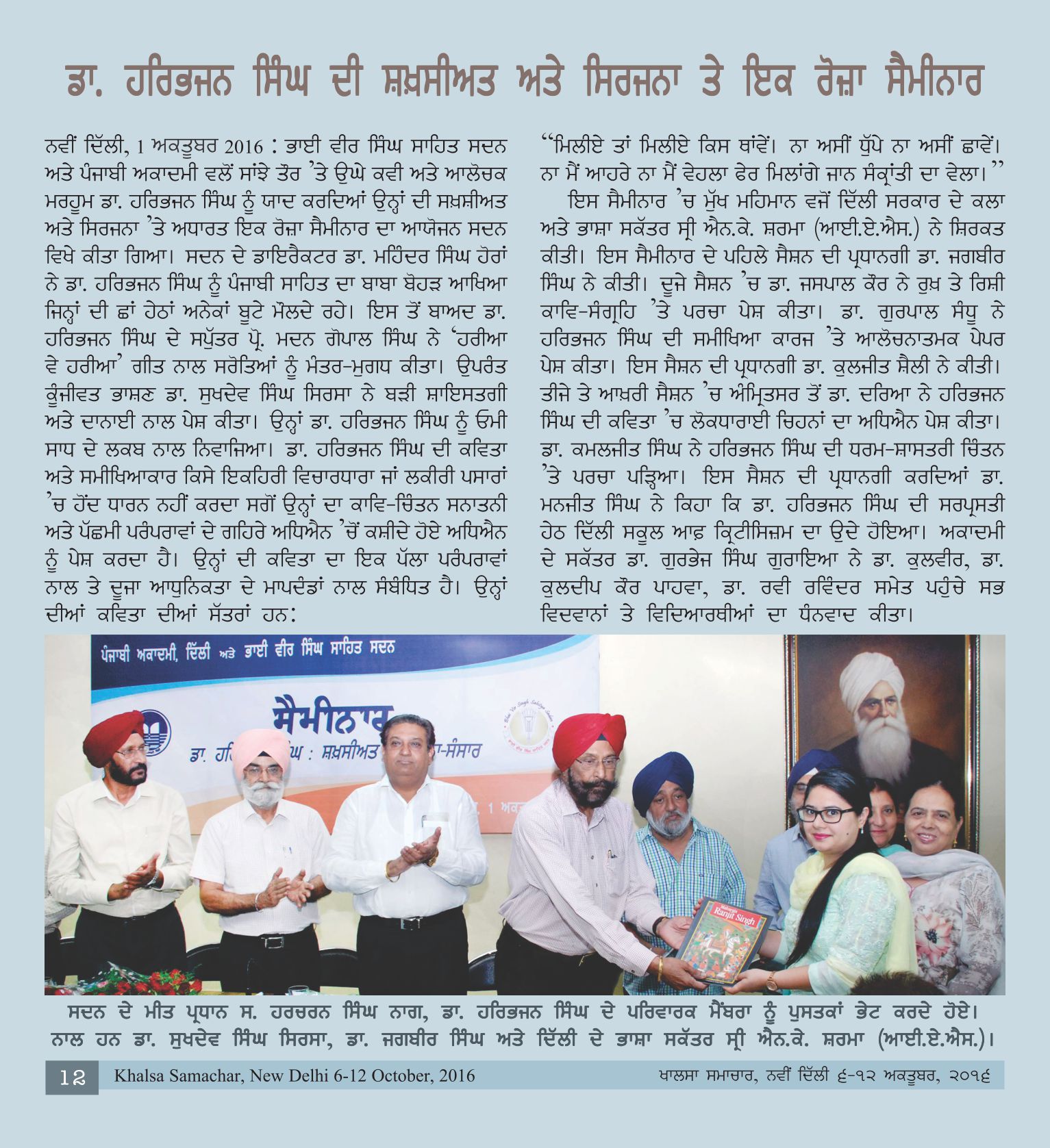 October, 1, 2016 Seminar held on "Dr.Harbhajan Singh : Shakhsiat te Rachna-Sansar" at Bhai Vir Singh Sahitya Sadan, New Delhi. >> Report