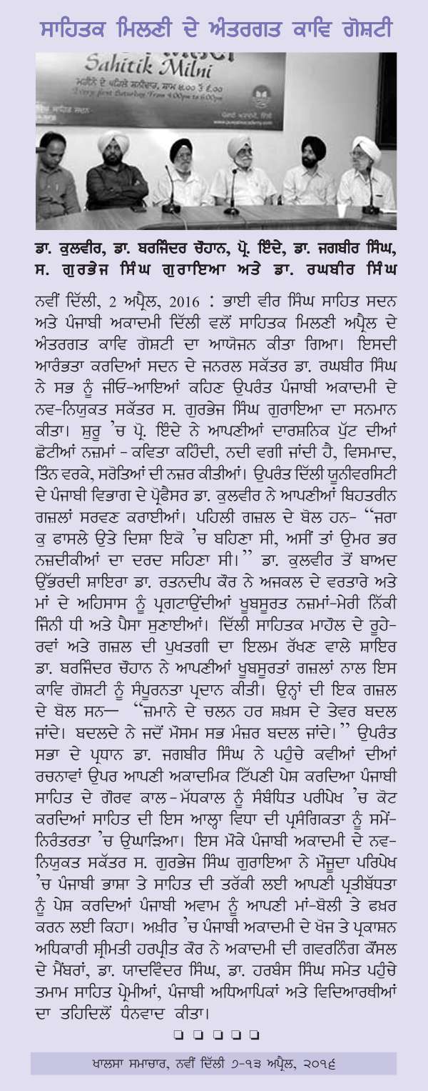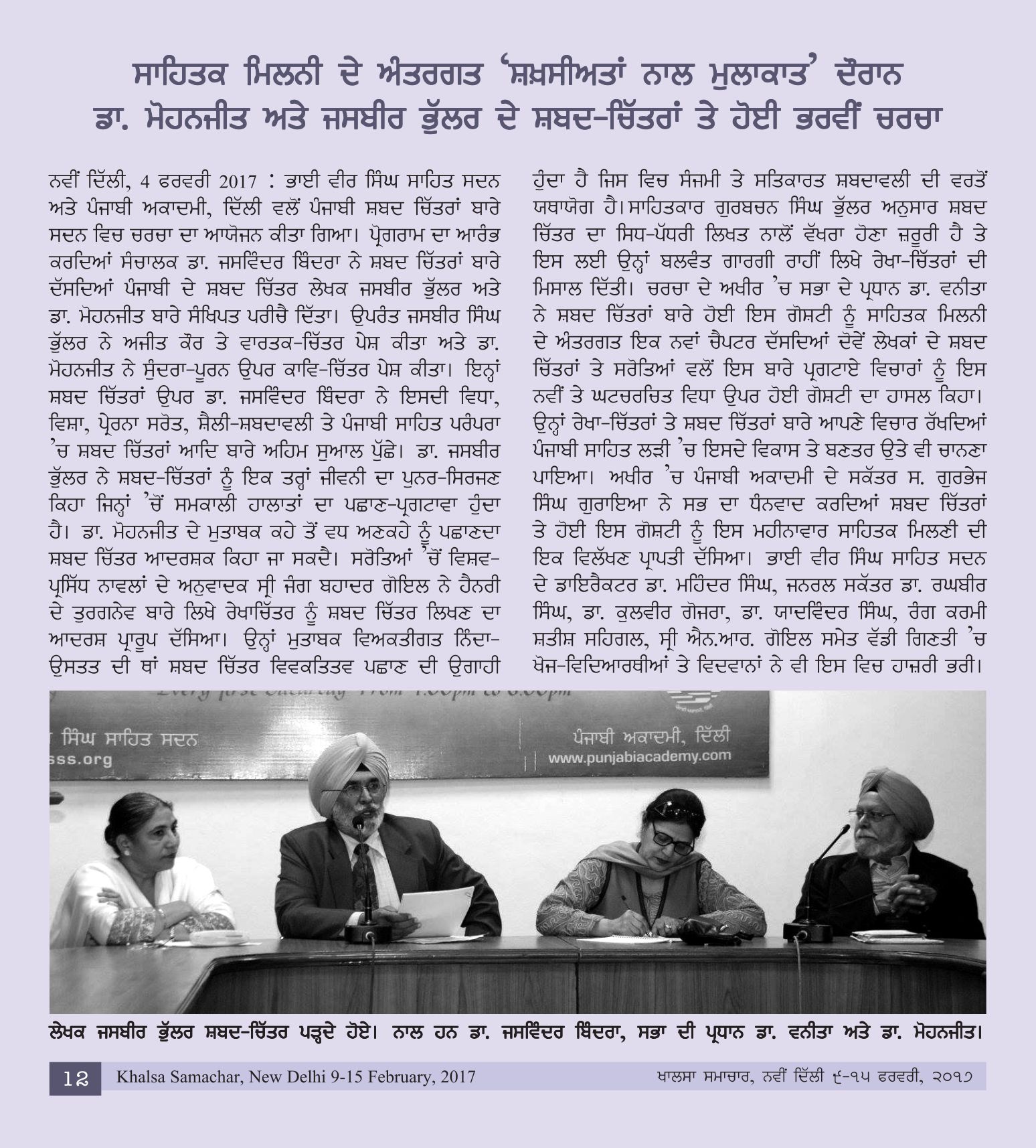 February 4, 2017 Shakhsiatan Naal Pachhan (Kalmi Chitran Rahin) : Writers: Dr. Mohanjit, S. Jasbir Bhullar; Compered by Dr. Jasvinder Kaur Bindra; Presided over by Dr. Vanita at Bhai Vir Singh Sahitya Sadan, New Delhi. >>Report