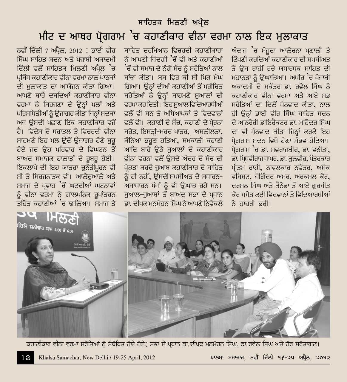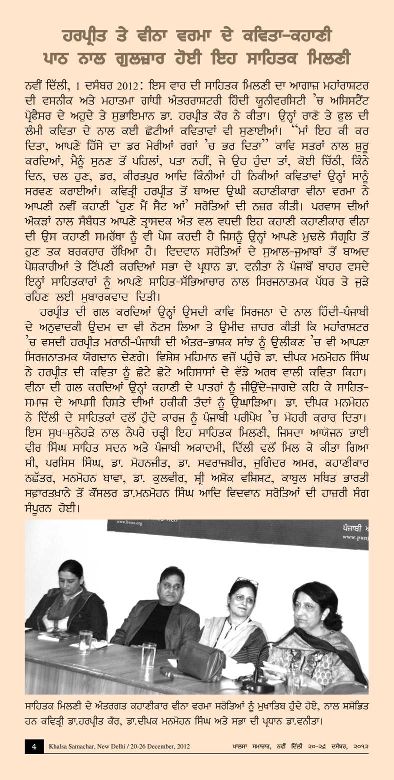 December 1, 2012, Meet the Author with Poet Dr.Harprit Kaur & Story Writers Veena Verma. presided by Dr. Vnita. Report>>