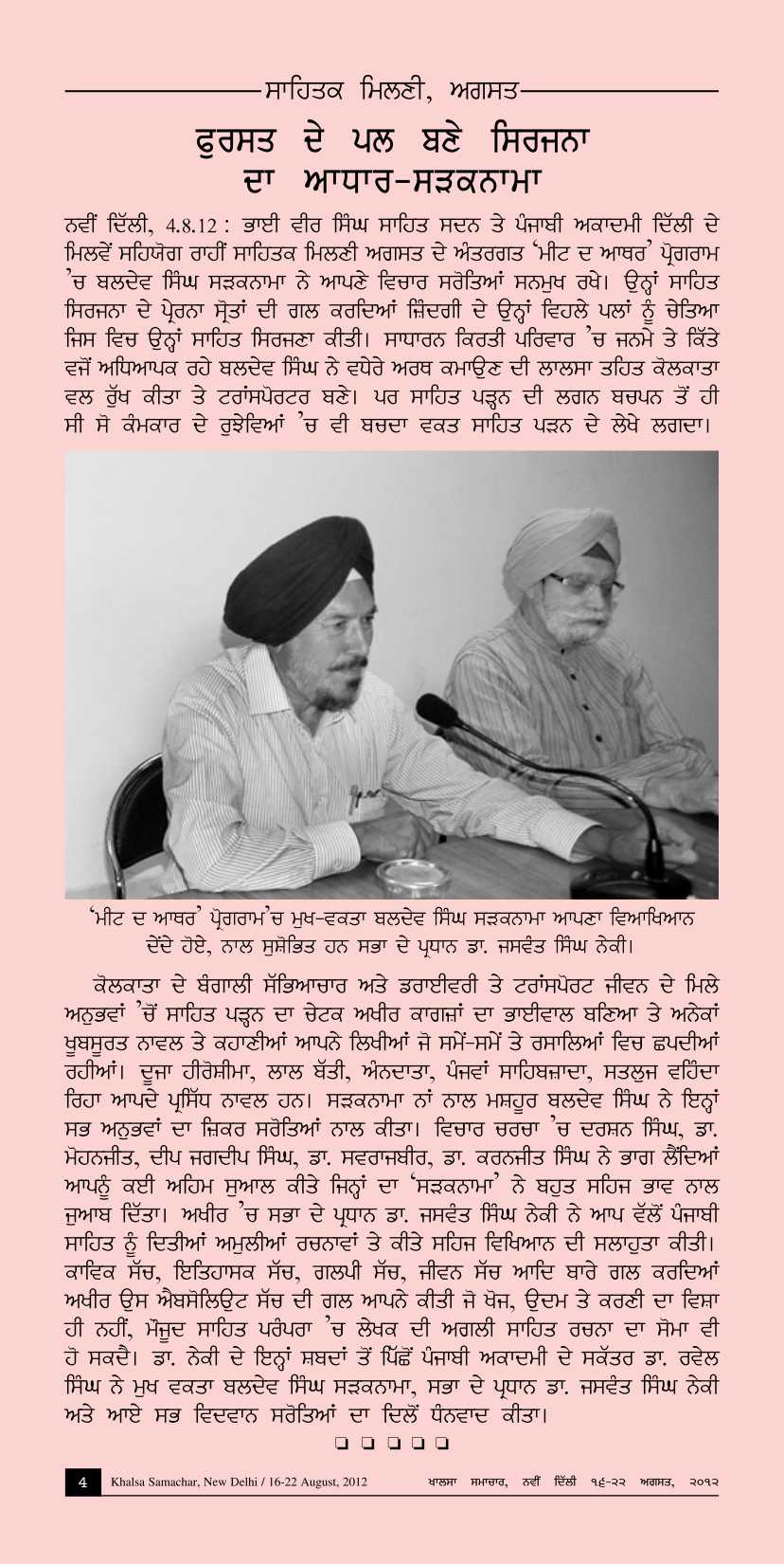 August 4, 2012, Meet the Author with Baldev Singh (Sadaknama). presided by Dr. Atamjit. Report>>
