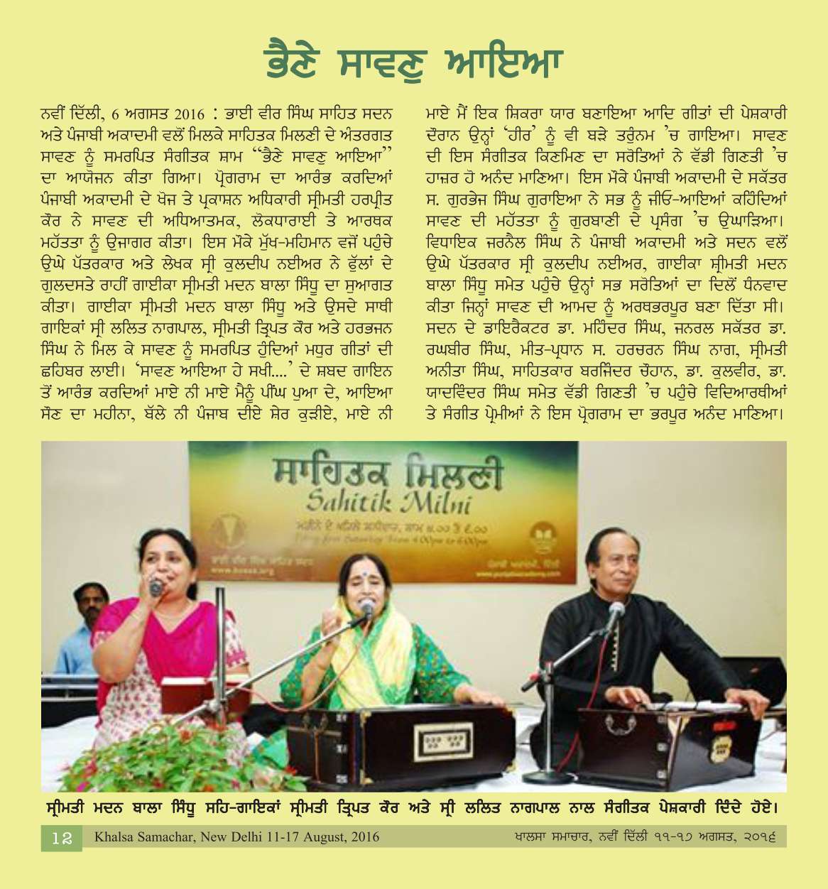 August, 6, 2016, Musical Evening : Bhaine Sawan aaya- Artist: Smt. Madan Bala Sindhu. Report>>
