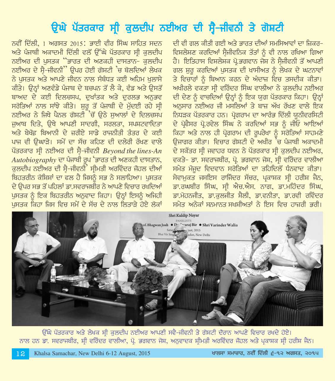 August 1, 2015, Panel Discussion on Punjabi translation of Beyond the lines : An Autobiography by Kuldip Nayar. Report>>