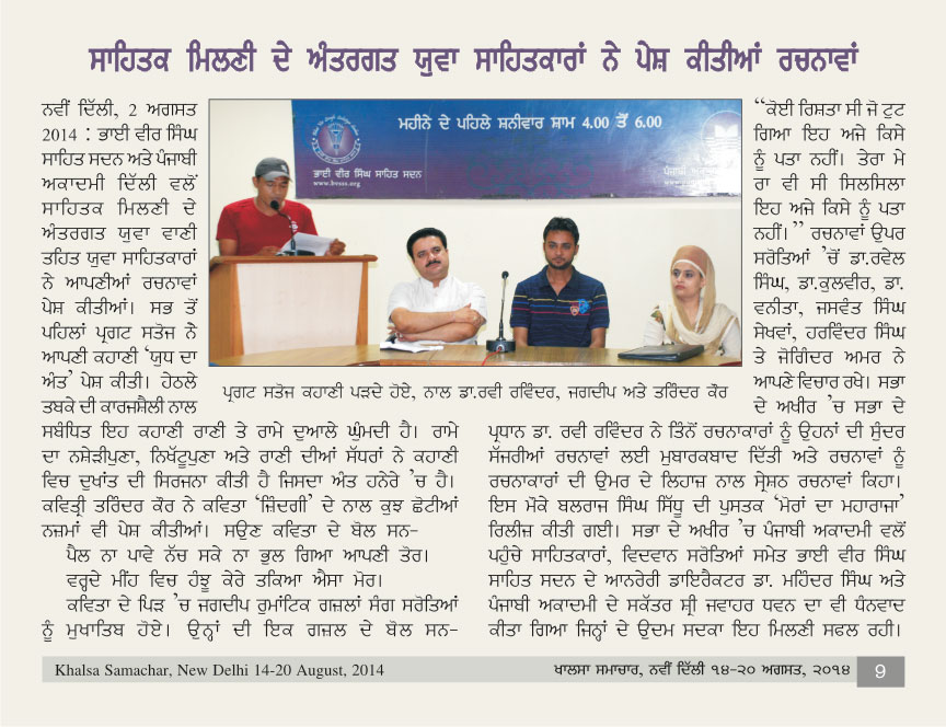 August 2, 2014, Yuva-Bani : Pargat Satauj (Story), Jagdeep (Ghazal) and Tarwinder Kaur (Poetry), Chair: Dr. Ravi Ravinder. Report>>