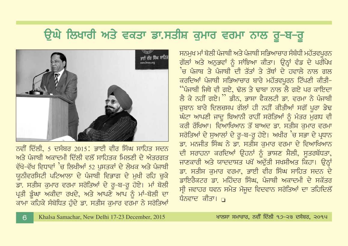 December 5, 2015, Meet the Author with Satish Kumar Verma, presided over by Dr.Manjit Singh. Report>>