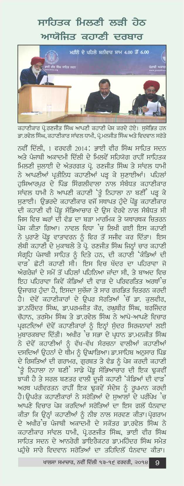 February 1, 2014, Kahani Darbar : Story Reading by Pro. Ranjeet Singh and Sawal Dhami, presided by Dr.Manjeet Singh. Report>>