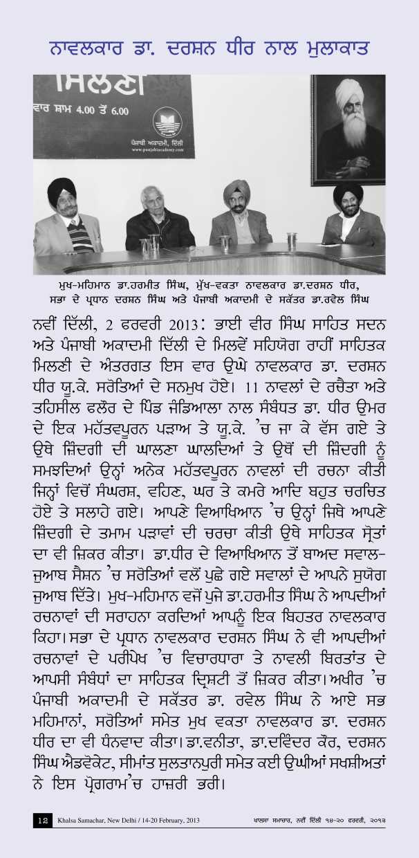 February 2, 2013, Meet the Author with Darshan Dhir (U.K.). presided over by Sh. Darshan Singh (Member, Governing Council, Punjabi Academy, Delhi). Report>>