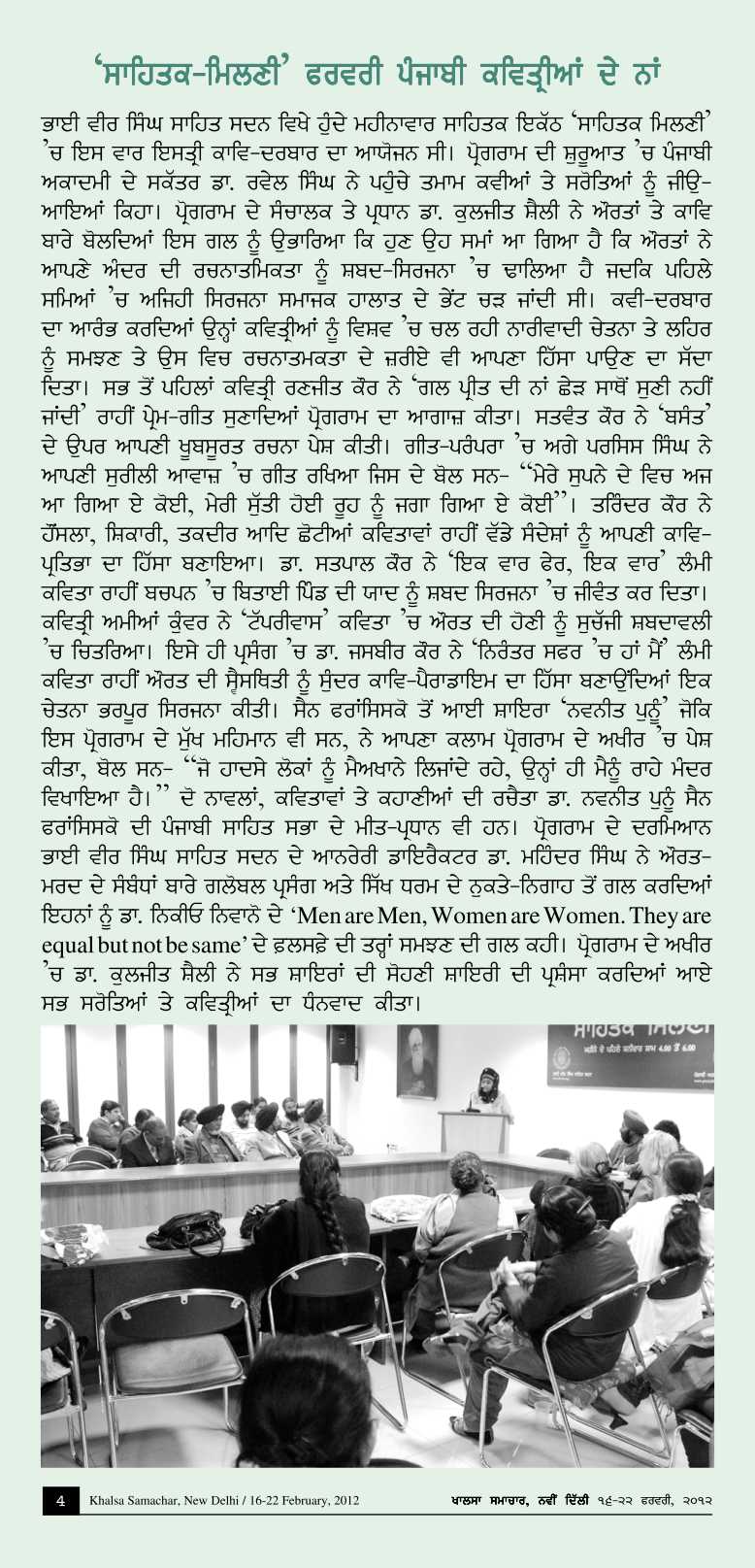 December 6, 2014, Women's Poet Meet : Invited Poets: Vanita, Amia Kunwar, Ranjit Kaur Jeet, Inderjit Kaur, Surinderjit Kaur, Tarinder Kaur, Kuldeep Pahwa, Arkamal Kaur, Satpal Kaur, Satnam Kaur, Pritma and Parveen Kaur. Report>>