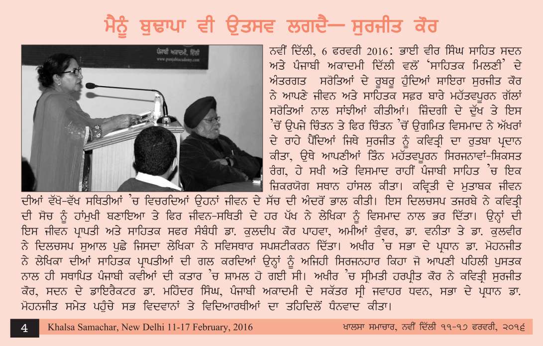 February 6, 2016, Meet the Author with Surjit Kaur (Canada), presided over by Mohanjit. Report>>