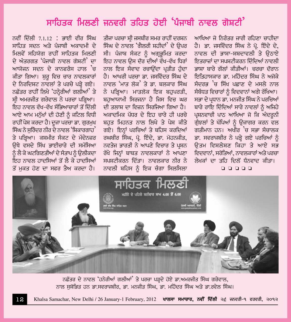 January 7, 2012, Punjabi Novel Goshti : Hanerian Galian "Nachatter" Paper Presented by Sh. Amarjeet Grewal, Shikargah "Surinder Neer" by Dr. Gurmukh Singh, Gallery Shahidan "Darshan Singh" by Sh. Jasbeer Samar, Maat-Lok "Dr.Jaswinder Singh" by Dr. Balkar Singh. Report>>