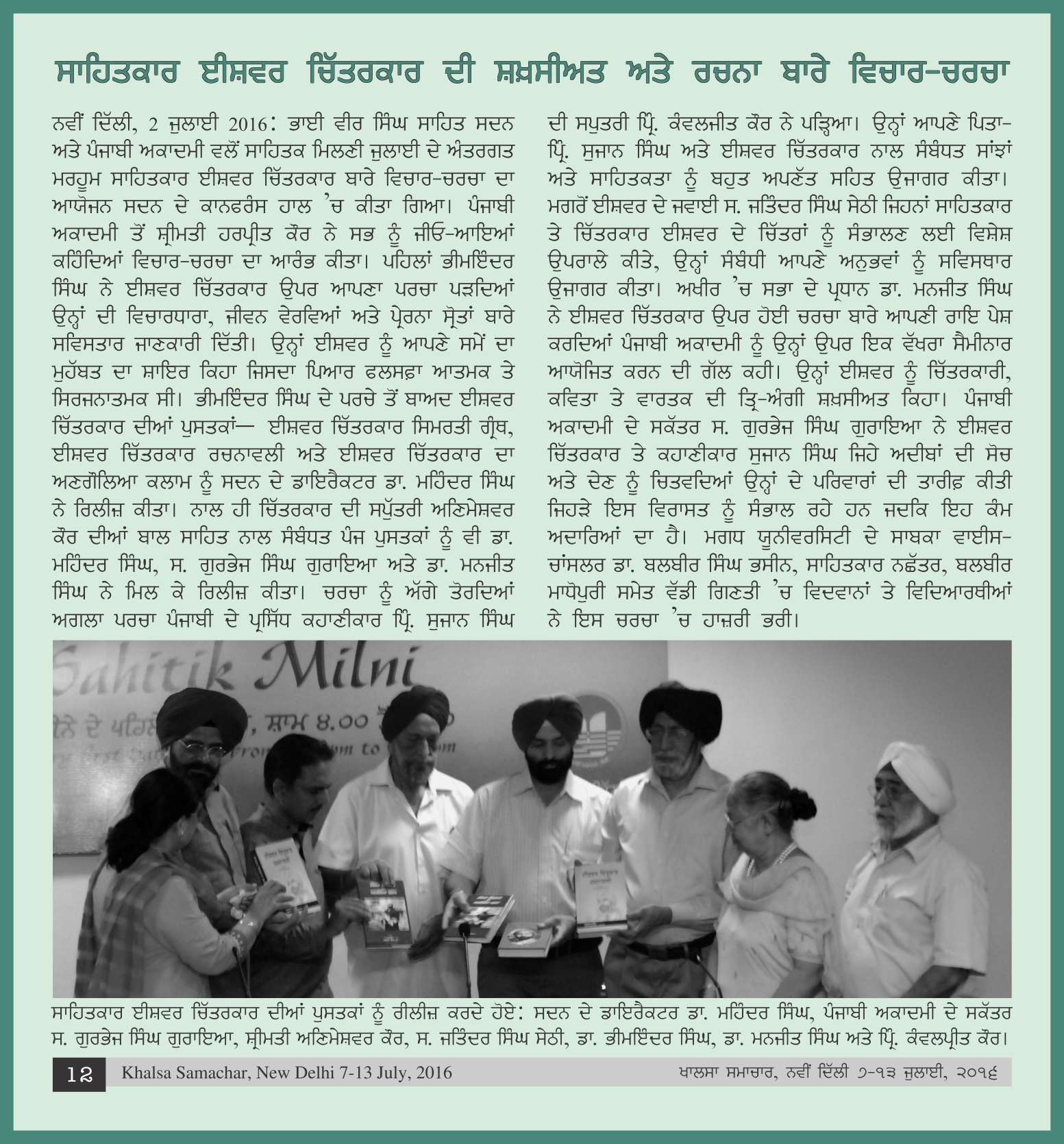 July, 2, 2016, Ishwar Chitarkar : Shakhsiat ate Rachna- Papers: Dr. Bhim Inder Singh, S. Jatinder Singh Sethi, Smt. Kawaljit Kaur, Presided over by Prof. Manjit Singh. Report>>