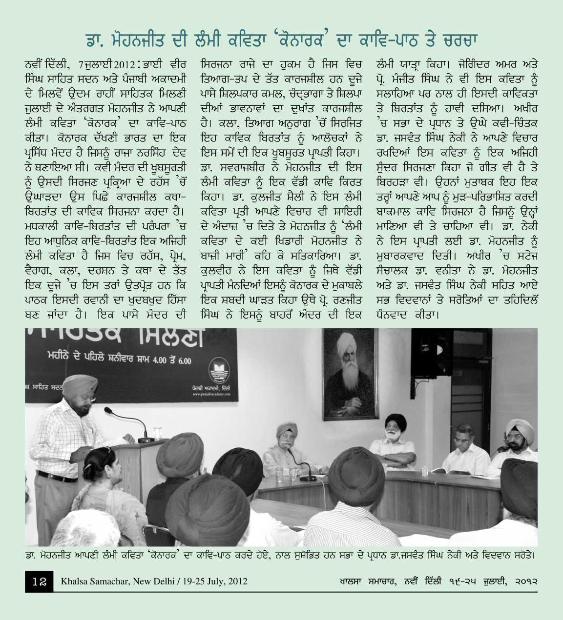 July 7, 2012, Reading of Epic poem 'Konark' : by Dr. Mohanjit. presided by Dr. Jaswant Singh Neki. Report>>