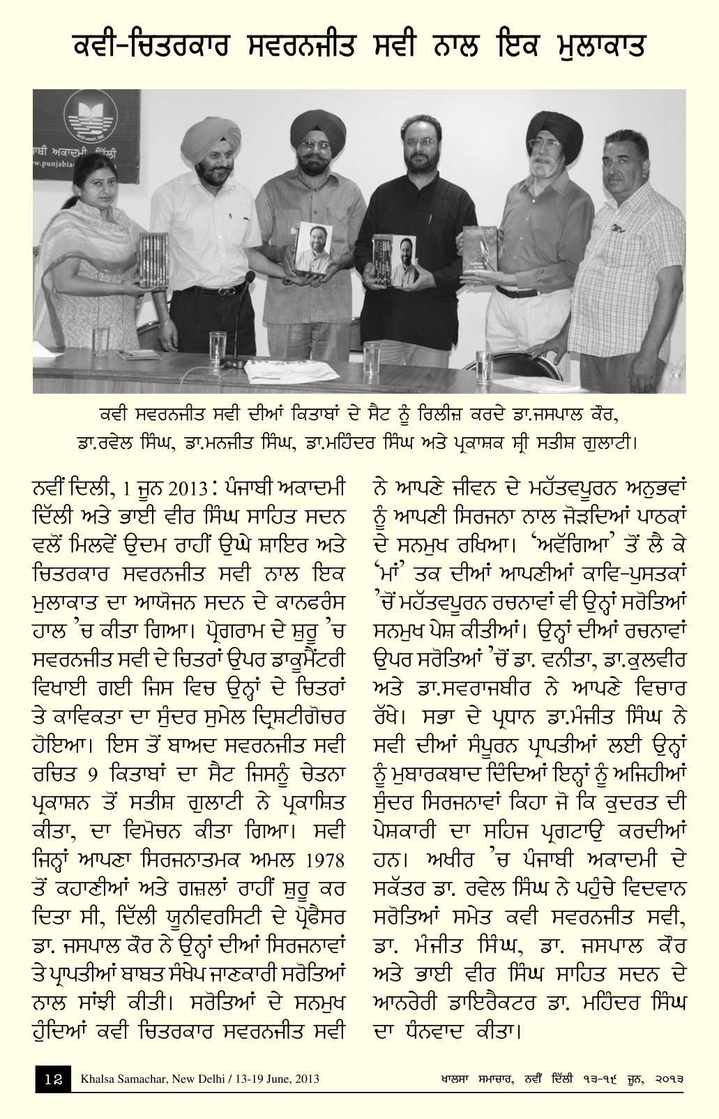 June 1, 2013, Meet the Author with Swaranjit Savi. Chair Dr. Manjit Singh, Intruduction Dr. Jaspal Kaur. Report>>