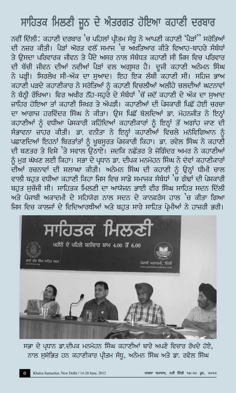 June 2, 2012, Kahani Darbar : Short Story Writers; Shri Aneman Singh, Smt. Pritam Sandhu. presided by Dr. Deepak Manmohan Singh. Report>>