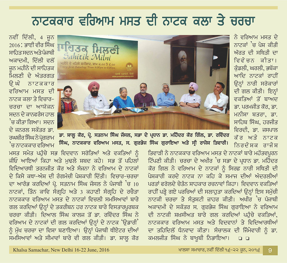 June 4, 2016, Waryam Mast Di Natak Kala- Papers: Prof. Satnam Singh Jassal, Dr. Ravinder Singh, Dr. Shalu Kaur, presided over by Dr. Mahinder Kaur Gill. Report>>