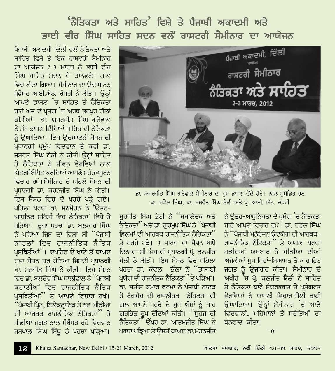 March 2-3, 2012, Rashtriya Seminar : Netikta Ate Sahit, Inaugural Session Welcome by Mrs.Anita Singh, Inaugural by Prof. I.N.Chauduri, Lecture by Sh.Amarjeet Singh Grewal and chaired by Dr. J.S.Neki. Report>>