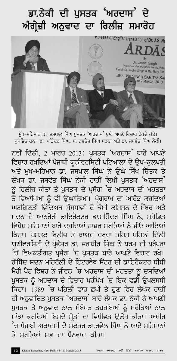 March 2, 2013, Release of English translation of Dr. J.S.Neki's celebrated work ARDAS : by Dr.Jaspal Singh (Vice-Chancellor, Punjabi University, Patiala). Panel: Dr. Jagbir Singh & Mary Pat Fisher. Report>>